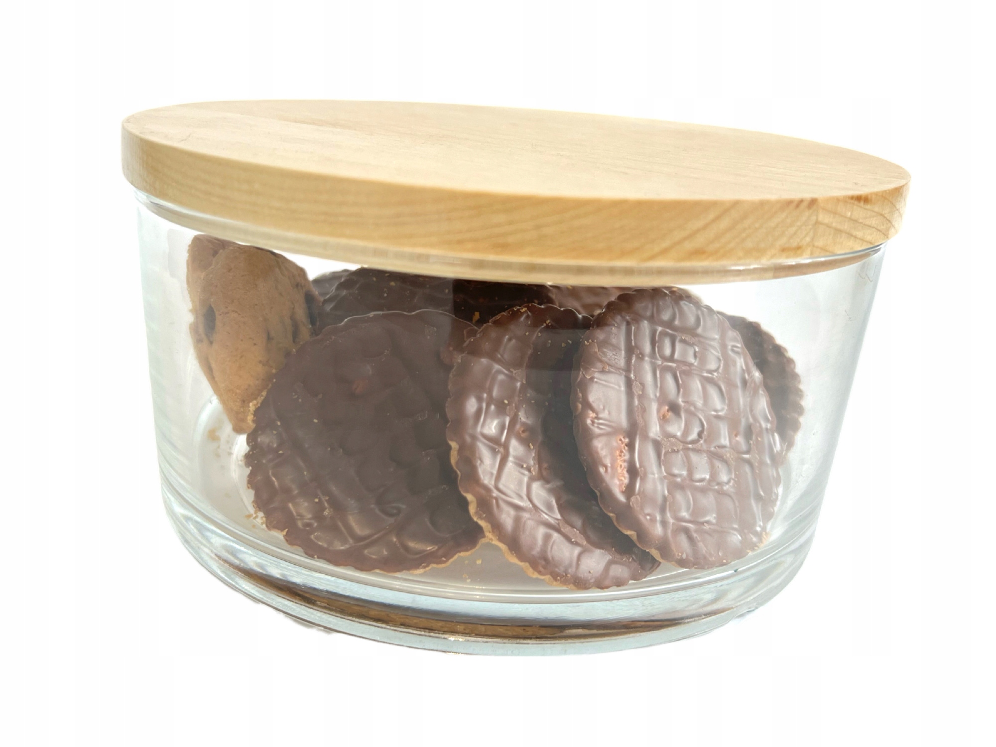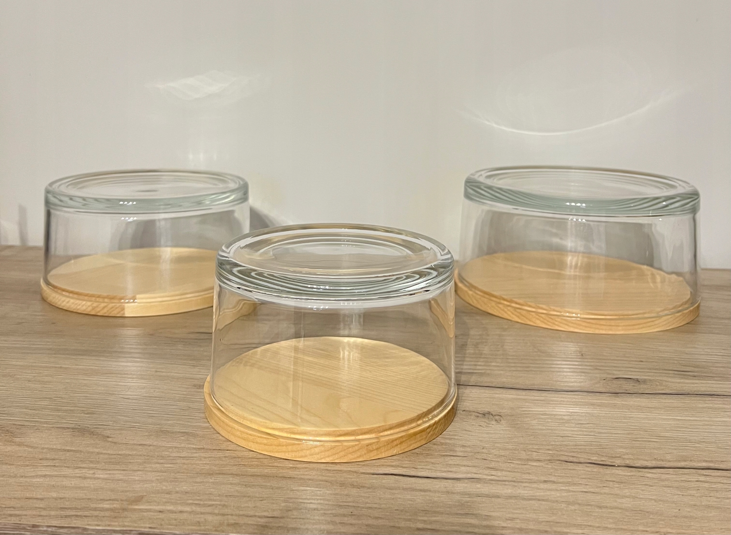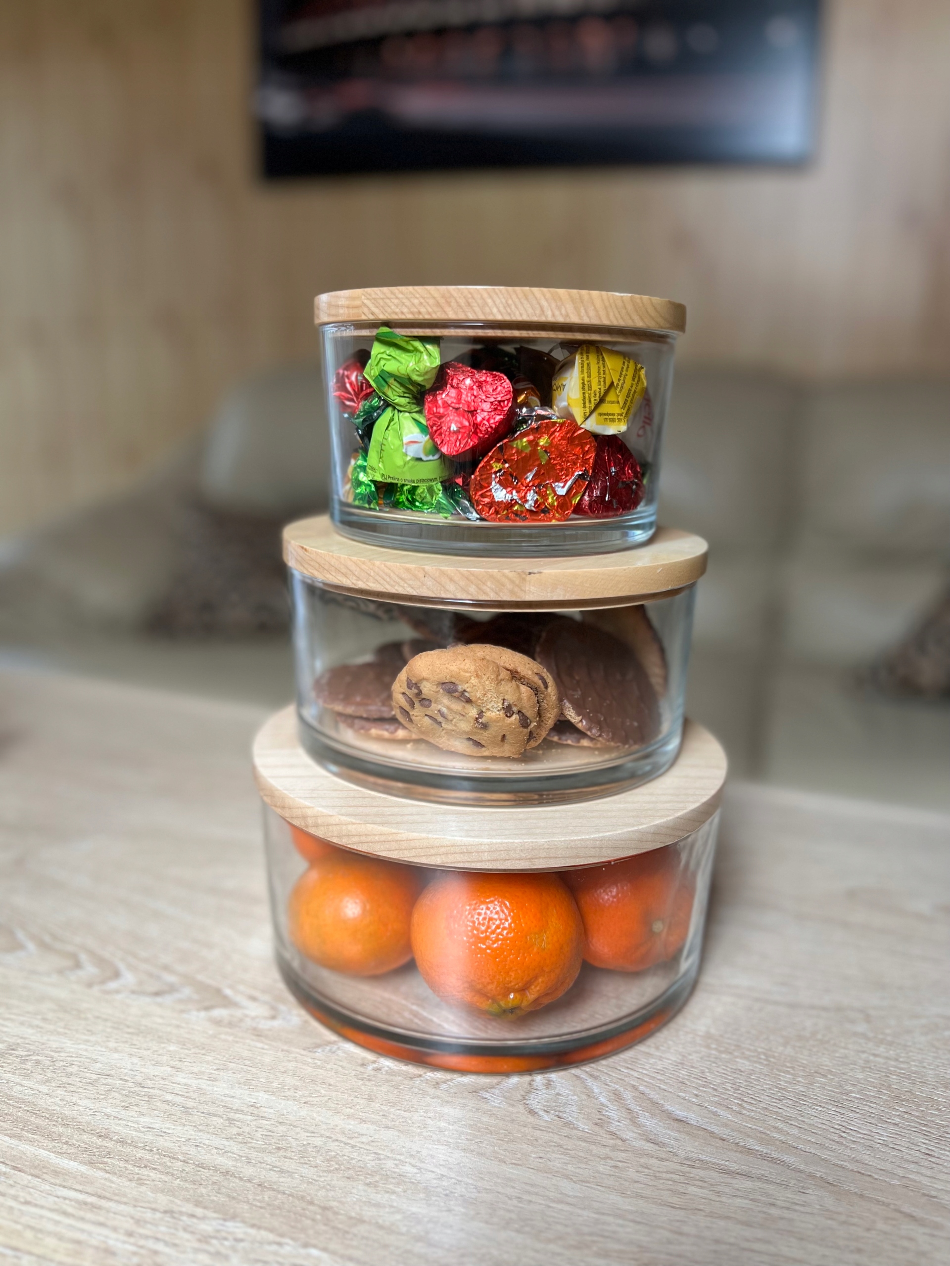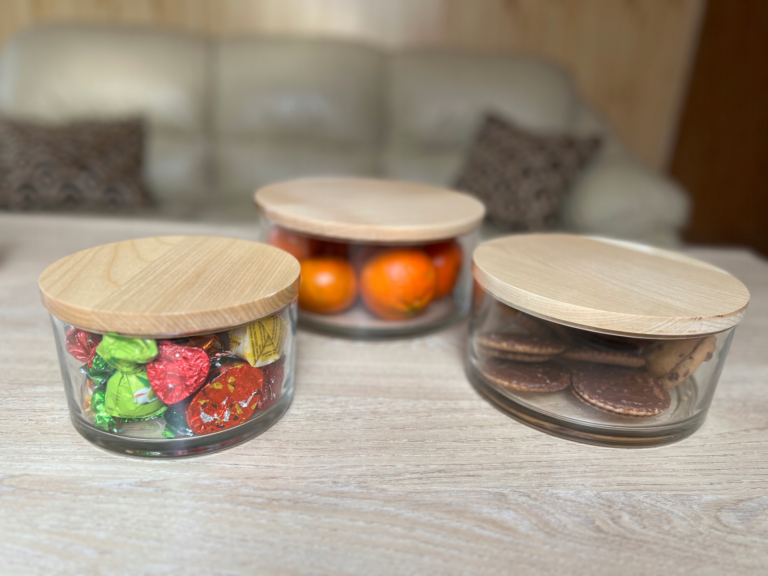 Стеклянные салатницы с деревянными крышками в тон. Они идеально подходят для хранения продуктов в холодильнике, в качестве специй, контейнеров для печенья или в качестве основы для композиций.