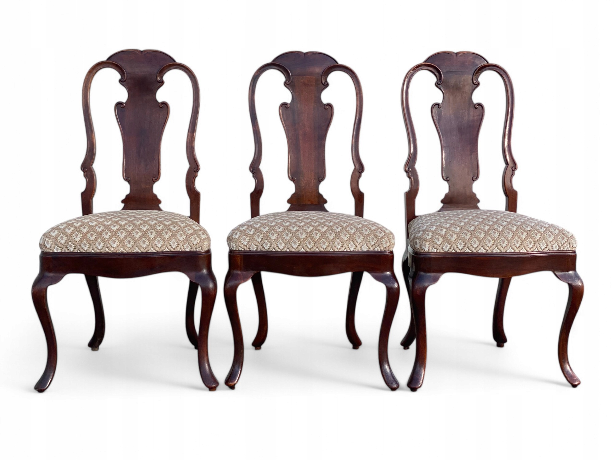 Набор из трех красивых стульев из красного дерева, чьи места были обрезаны ярким рисунком. Но у них есть небольшие признаки использования, места видны в местах нежных функций, ссадины. Тем не менее, это немного видимое место, и недостаток не поймал. Вставки 48 см