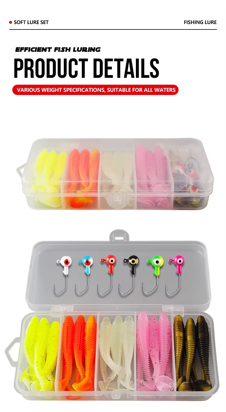 НАБОР ВЫСОКОКАЧЕСТВЕННЫХ МЯГКИХ ПРИМАНОК - 30 УДАРНЫХ РИППОВ + 6 ЦВЕТНЫХ ДЖИГ-ГОЛОВОК + КОРОБКА