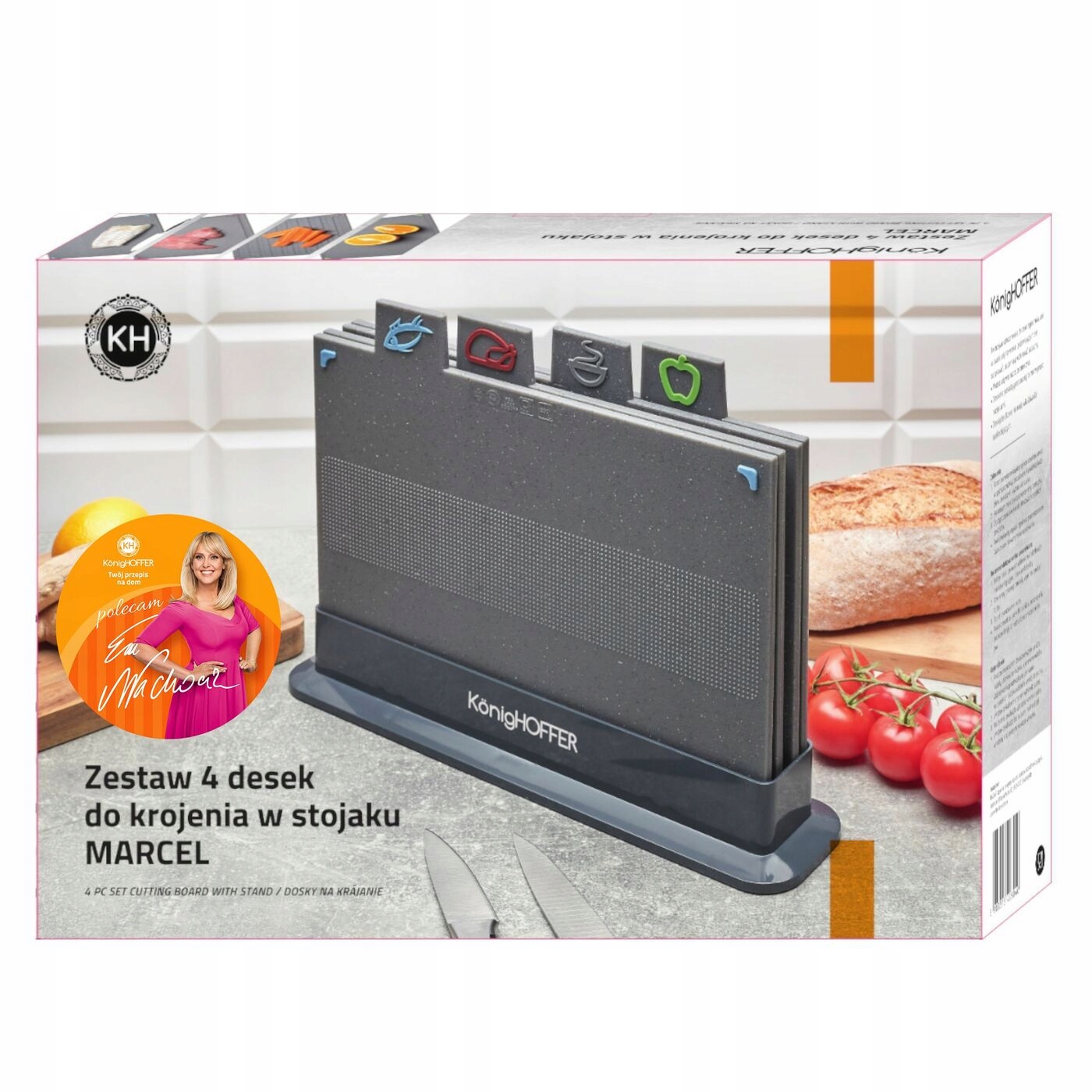 Набор из 4 разделочных досок Konighoffer Marcel с подставкой 29 х 22,5 х 0,6 см изготовлен из пластика. Его дизайн вдохновлен гранитом. На кухонной стойке смотрится элегантно. Это также полезно при нарезке различных ингредиентов. Каждая доска служит разным целям. Их поверхность специально приспособлена для нарезки хлеба, мяса, овощей, фруктов и нежной рыбы. Они не тупят ножи и не впитывают ароматы. Их также легко мыть, например, в домашней посудомоечной машине. Силиконовые вставки различных цветов предотвращают скольжение по столу во время резки. В комплект Konighoffer Marcel входят 4 двусторонние доски, изготовленные без добавления BPA. По независимому мнению, Дж.С. Набор Hamilton соответствует всем европейским стандартам и может использоваться при безопасном контакте с пищевыми продуктами. Это подтверждается полученным им индивидуальным сертификатом. Он имеет уникальный номер и присвоен Дж.С. Hamilton – компания со всемирно известной специализированной лабораторной базой. Продукт рекомендует Ева Вахович. Как амбассадор бренда Konighoffer, она горячо и с улыбкой рекомендует его для домашнего использования. Вместе с ним вы получите свой рецепт для дома. Это один из лучших вариантов в этой категории!
