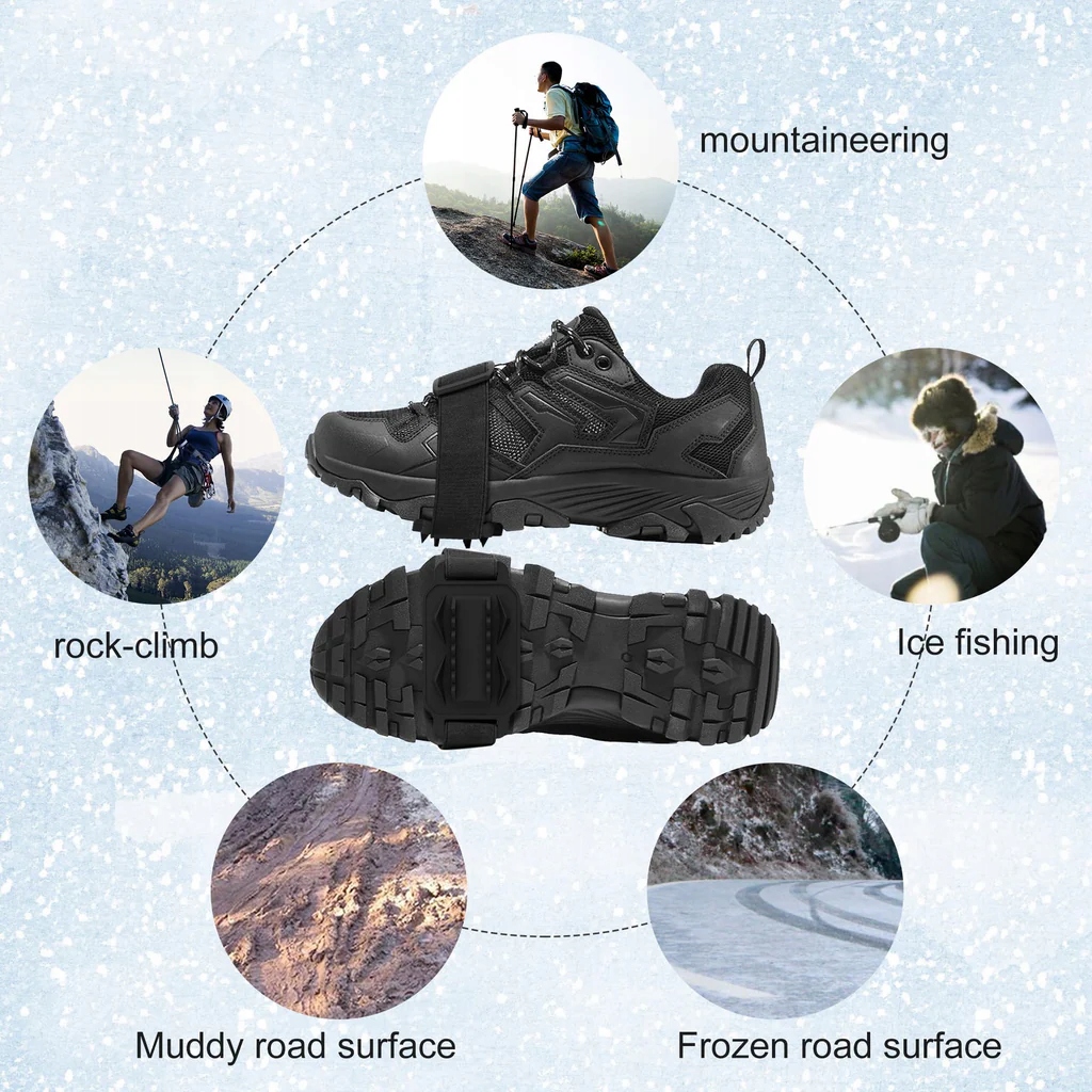 - Широко используется: подходит для различных типов обуви, такой как обувь, спортивная обувь, походная обувь обувь, ботинки и т. д. Зимой неровная местность, обледенелые дороги, мокрая трава и повседневное использование, прогулки по снегу, уборка снега, подледная рыбалка, походы и многое другое обеспечат вашу безопасность.