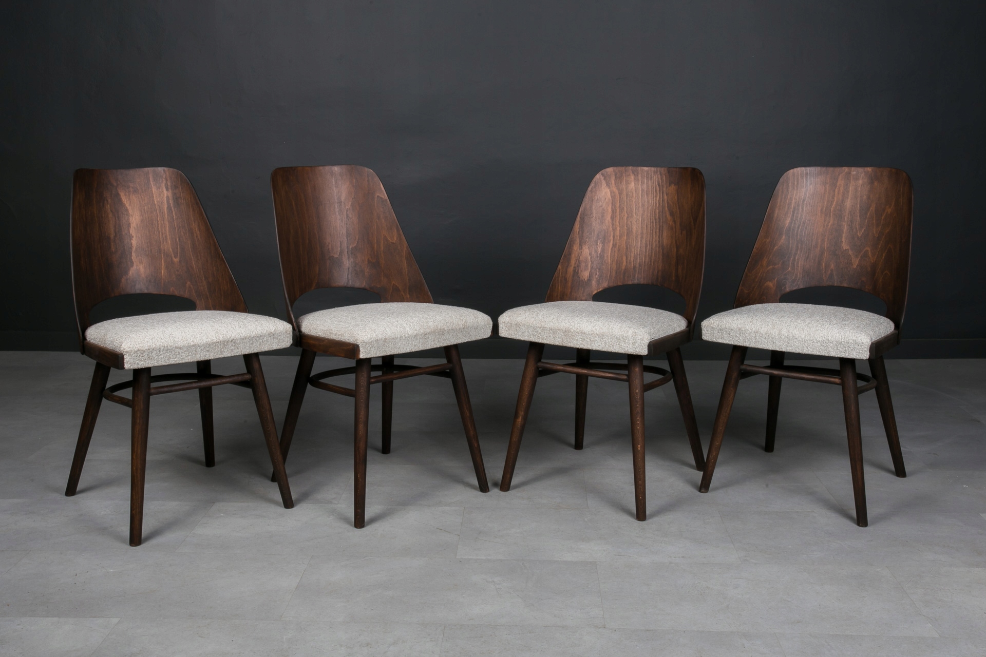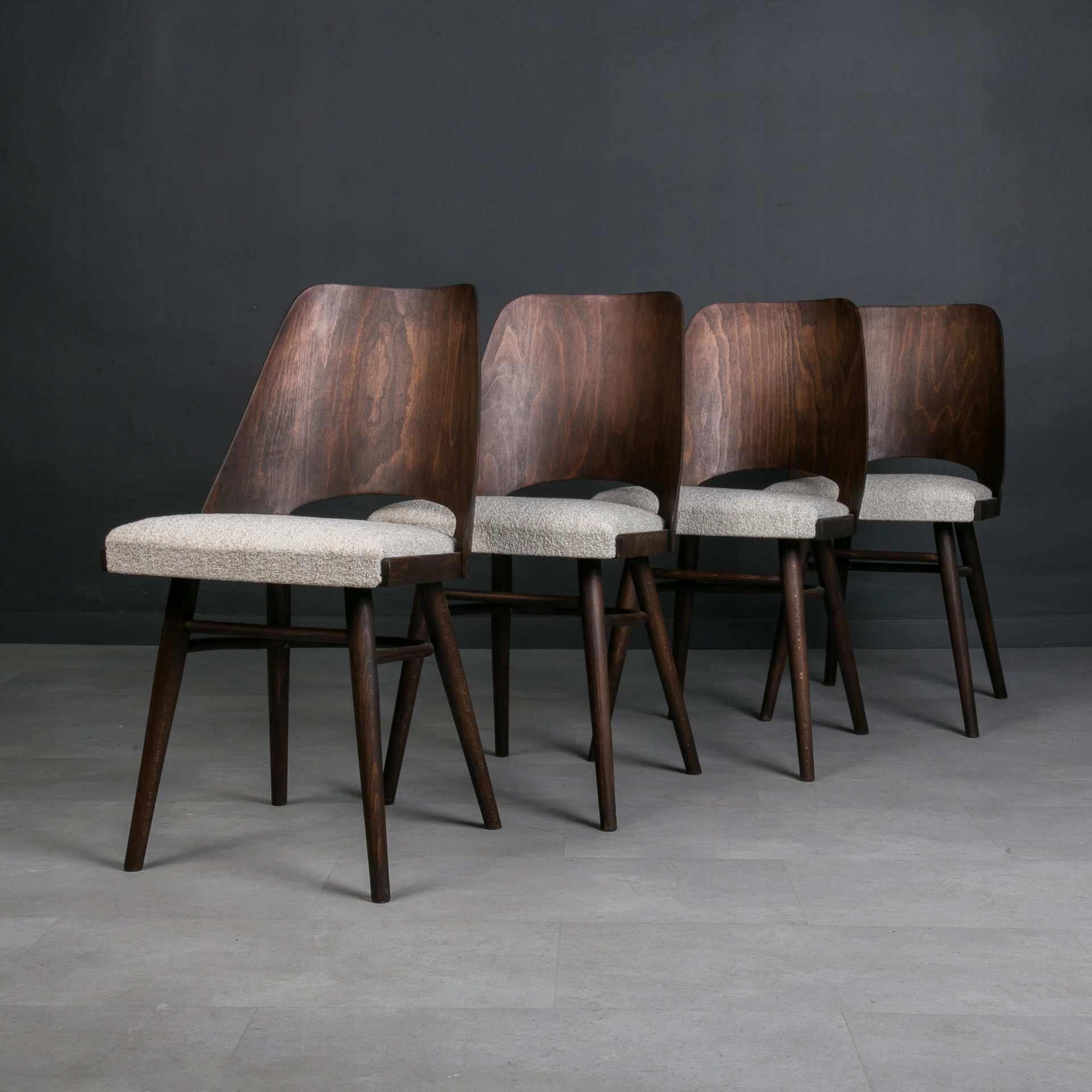 Набор стульев был разработан Радомиром Хофманом и изготовлен в Чехословакии в 1960-х годах. Каркас стула изготовлен из древесины бука, спинка – из гнутой фанеры, шпонированной буком. Стулья прошли полную реконструкцию, деревянные элементы очищены от старых покрытий и обработаны высококачественным маслом. Сиденья имеют новое наполнение, обтянуты мясистой тканью-букле кремово-белого цвета. Конструкция очень устойчивая и прочная. Стулья легкие по форме и удобные в использовании.