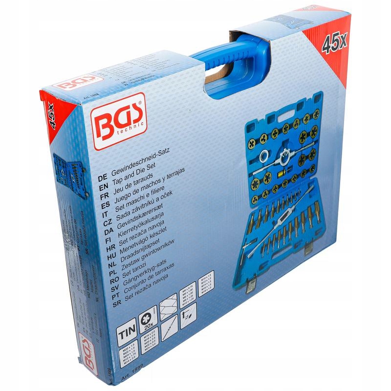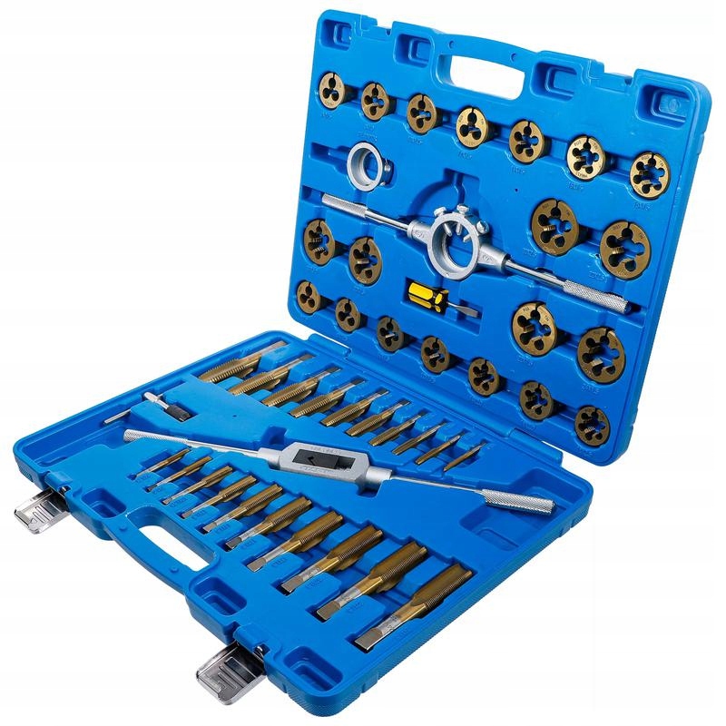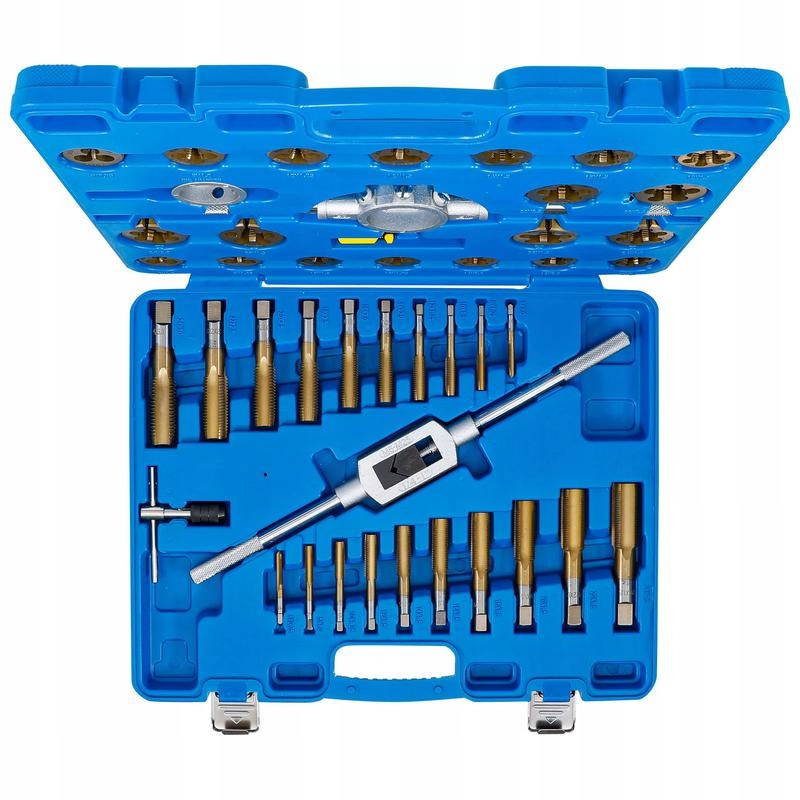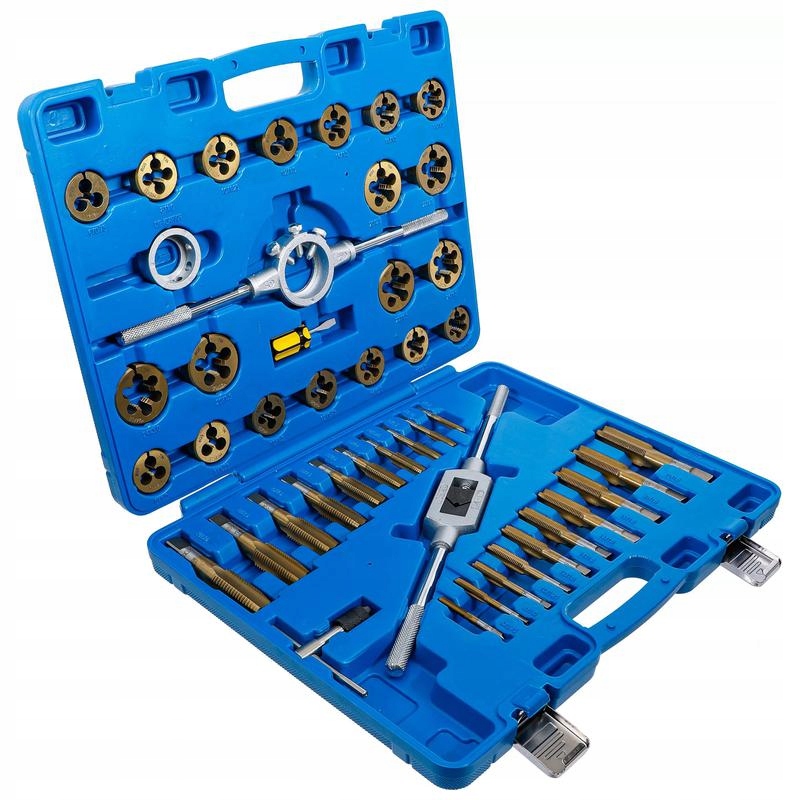 - 20 метчиков для внутренней резьбы и 20 плашек для наружной резьбы (по 1 на размер) M6 x 0,75 - M8 x 1,00 - M6 x 1,00 - M8 x 1,25 - M10 x 1,25 - M10 x 1,5 - M12 x 1,5 - M14 x 1,5 - M16 x 1,5 - M18 x 1,5 - M20 x 1,5 - M22 x 1,5 - M24 x 1,5 - M12 x 1,75 - M14 x 2,0 - M16 x 2,0 - M18 x 2,5 - M20 x 2,5 - M22 x 2,5 - M24 x 3,0