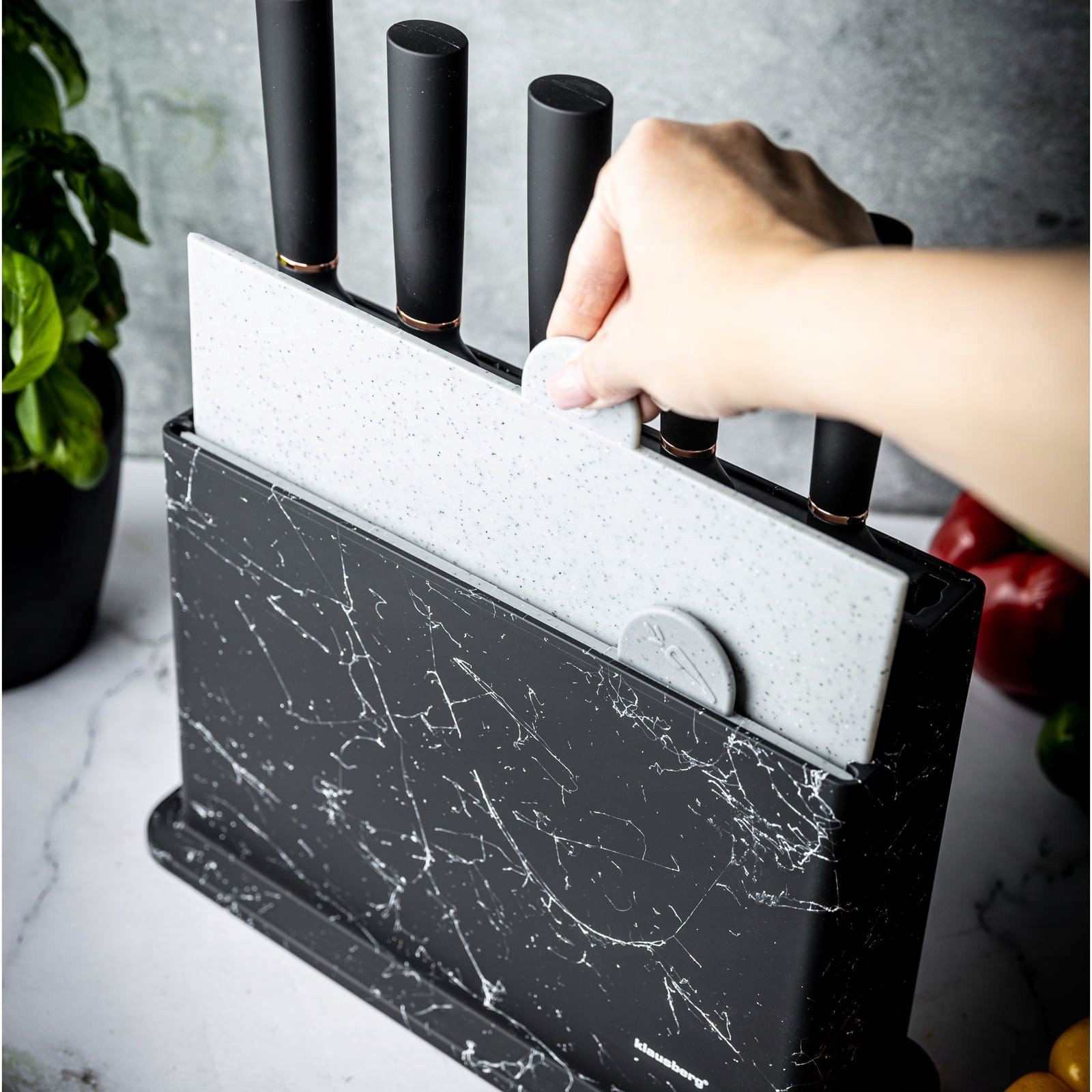 Кроме того, набор включает в себя практическое блок/стенд для всех элементов набора, которые не только помогают сохранить порядок на кухне, но также дает элегантный характер всему набору.