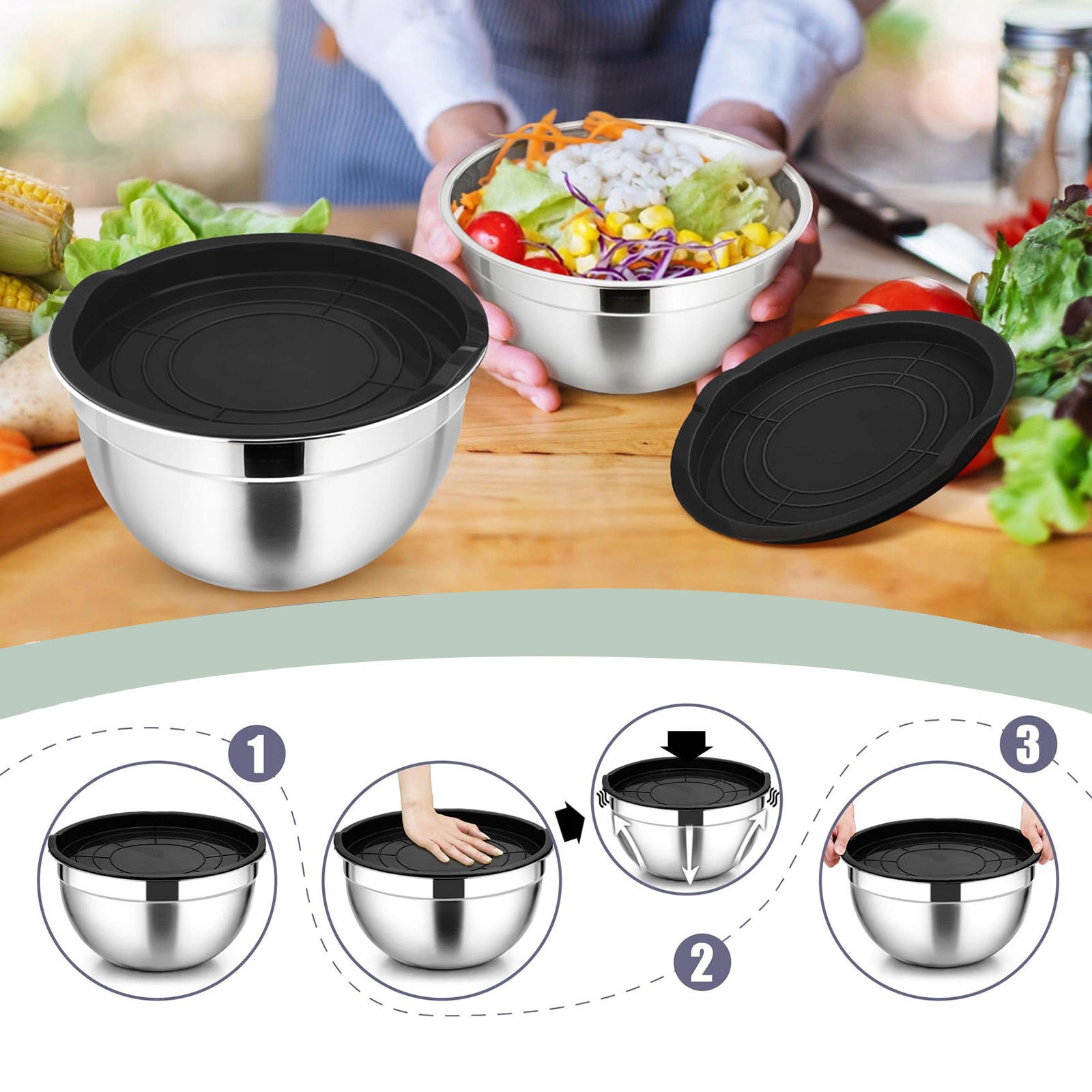 Набор из 5 мисок с крышками и герметичными герметичными нержавеющими чашами из нержавеющей стали.