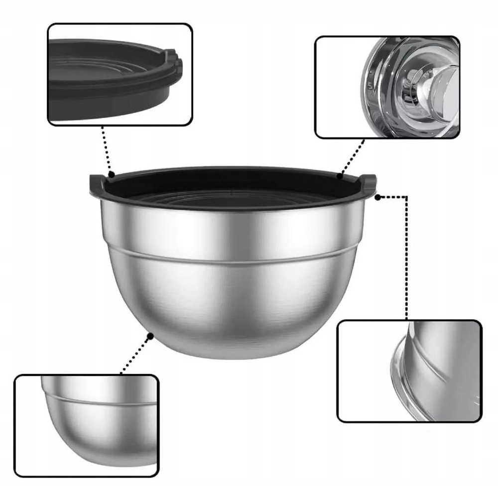 Набор из 5 мисок для салатов, мисок из нержавеющей стали с герметическими крышками, размером 4,5 л, 2,7 л, 1,6 л, 1,1 л, 0,7 л, набор миклений для кухни, анти -скольжение (серебро)