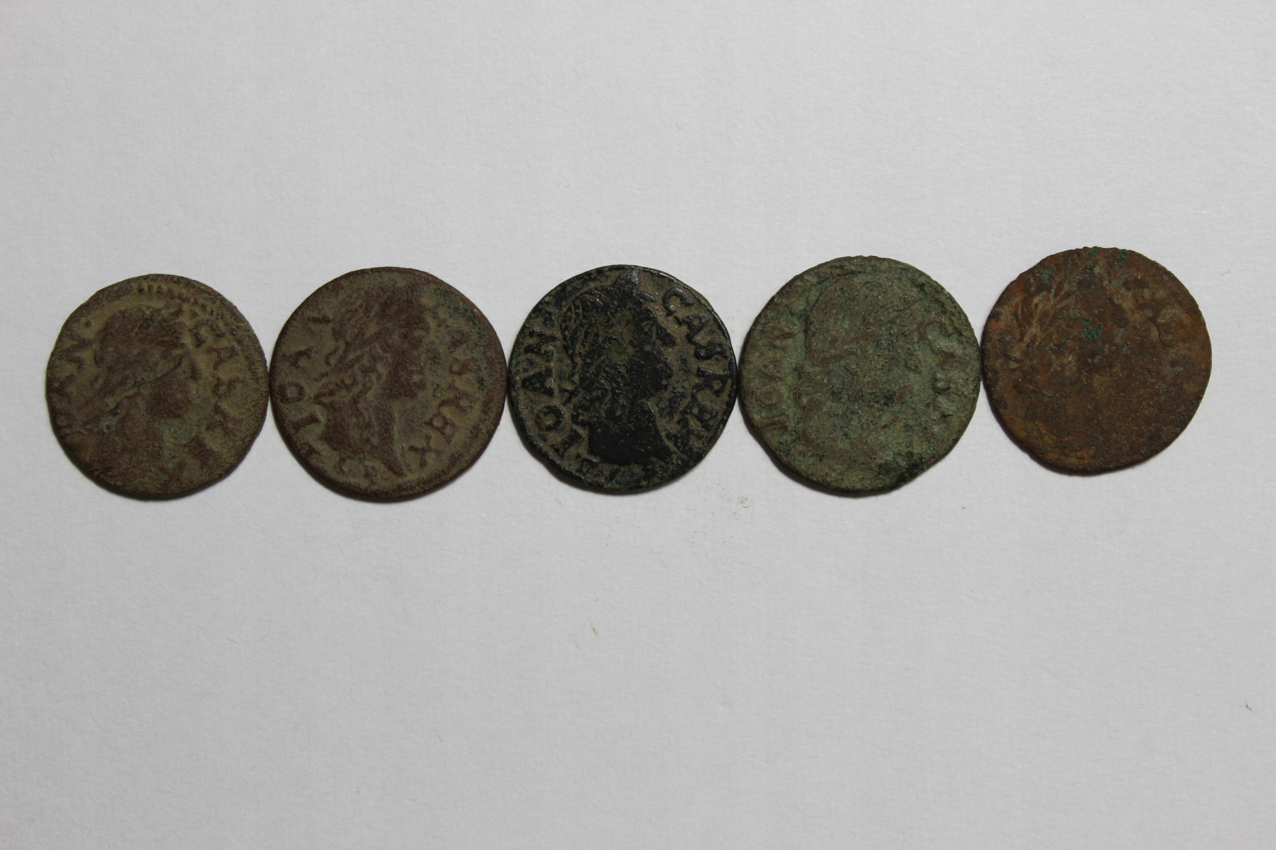 Набор из пяти монет с большими признаками износа, ссадин и рас, но все время частично разборчиво. Образцы в различных состояниях, с различными рейдами и коррозией/патиной.