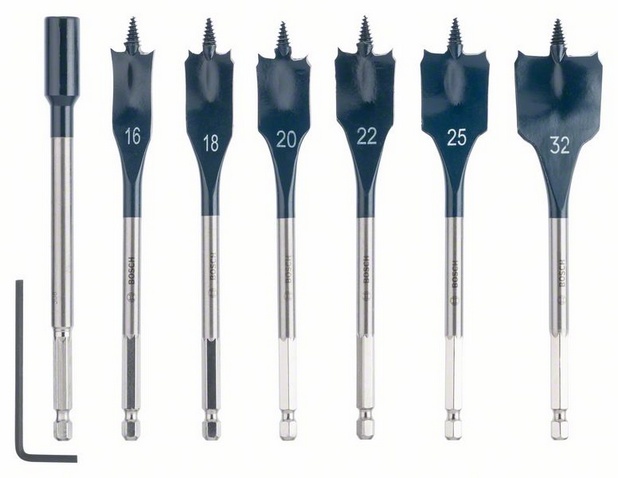 Набор плоских сверл из 7 предметов с удлинителем (152 мм) по дереву от Bosch SELF CUT Speed.