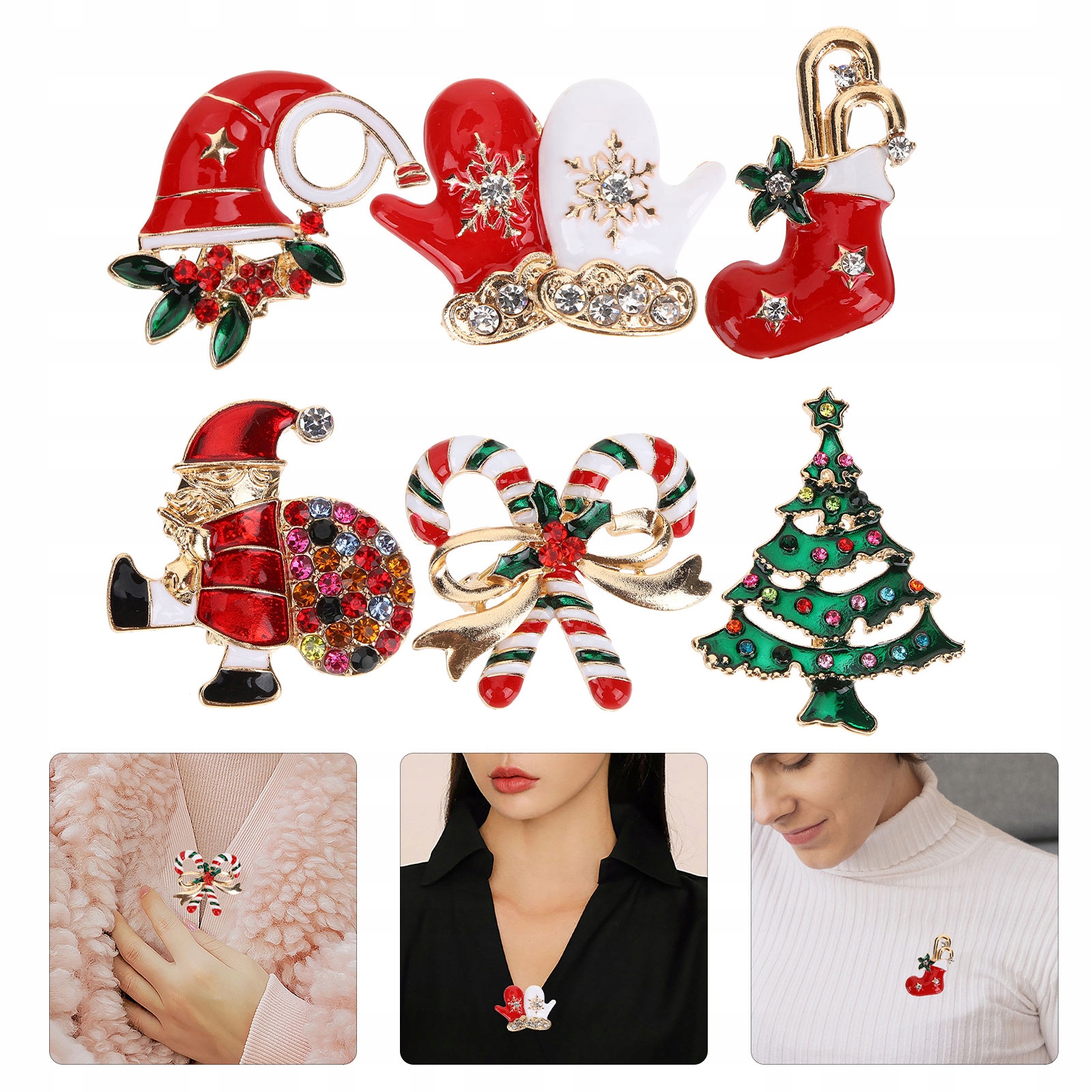 Набор из 6 рождественских брошей с кристаллами и рождественскими элементами