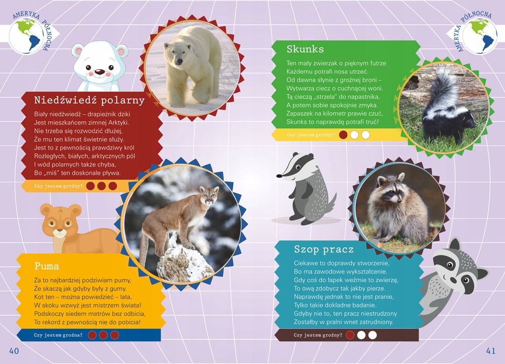 (...) Все животные в этой книге сгруппированы в соответствии с континентами, на которых встречается данное животное чаще всего (или исключительно). Конечно, эта публикация слишком мала, чтобы разместить их всех, но автор на своих картах опубликовал наиболее распространенные и самые интересные виды, которые, безусловно, заинтересованы нашим детям. Как он показал их здесь? Очень очень просто. Есть фотографии каждого из них, веселый рисунок и стихотворение, в котором обсуждается самая важная информация об этом. И есть три точки под каждой детской. Иногда они все окрашены, в других случаях только некоторые из них. Эти точки представляют собой масштаб опасности данного существа для человека. Если все три точки окрашены в белый цвет - лучше пройти такого питомца на расстоянии. Однако, если только одна вещь - мы не боимся такой встречи. Это правда, что стихи о каждом из этих животных действительно очень короткие, но давайте не будем забывать, что это чтение направлено скорее на малышей, поэтому, если бы они были длиннее, они могли бы носить маленького читателя. И да - все, как должно быть