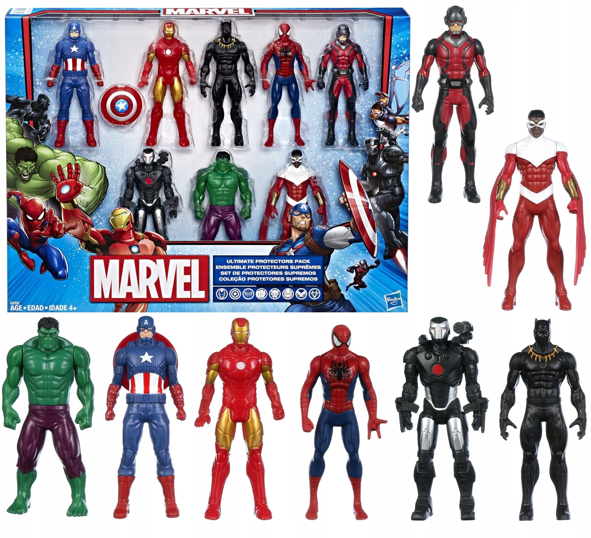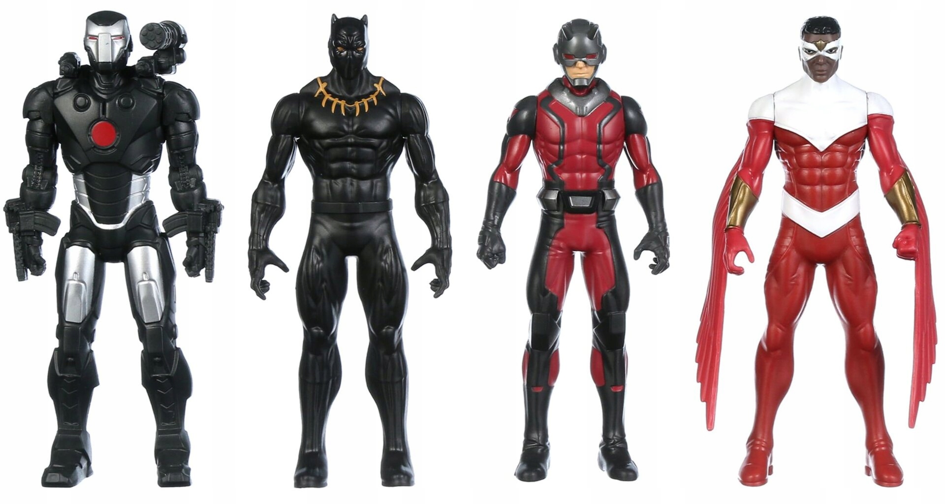 - Капитан Америка, Железный Человек, Черная Пантера, Человек-Паук, Человек-Муравей, Военная Машина, Халк, Сокол