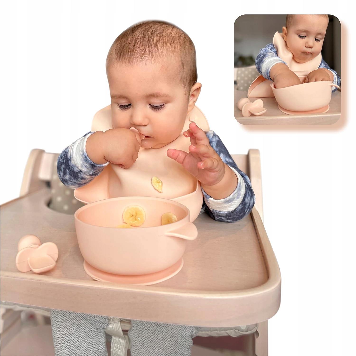 Эти детские ремни снабжены силиконовым нагрудником, который предотвращает попадание еды в рот ребенка. Миска с защитой от опрокидывания оснащена присоской, которую можно прикрепить к стульчикам и столам, чтобы она не смещалась во время еды. Входящая в комплект накладка предотвращает загрязнение стола.