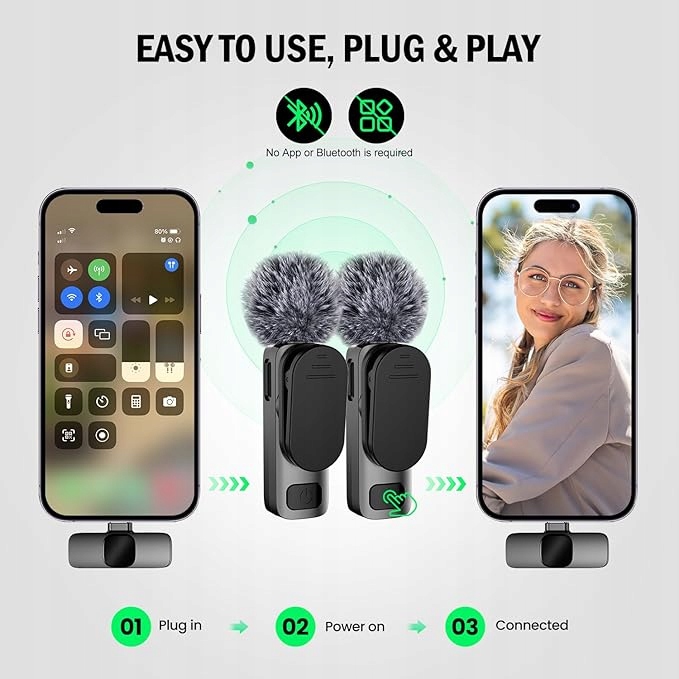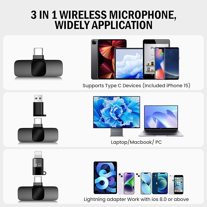 - Совместимые устройства: беспроводной петличный микрофон 3-в-1 с адаптером — для iPhone (включая iPhone 15), iPad/устройств Android (тип C) и компьютеров. Мини-микрофон для записи видео и подкастов.