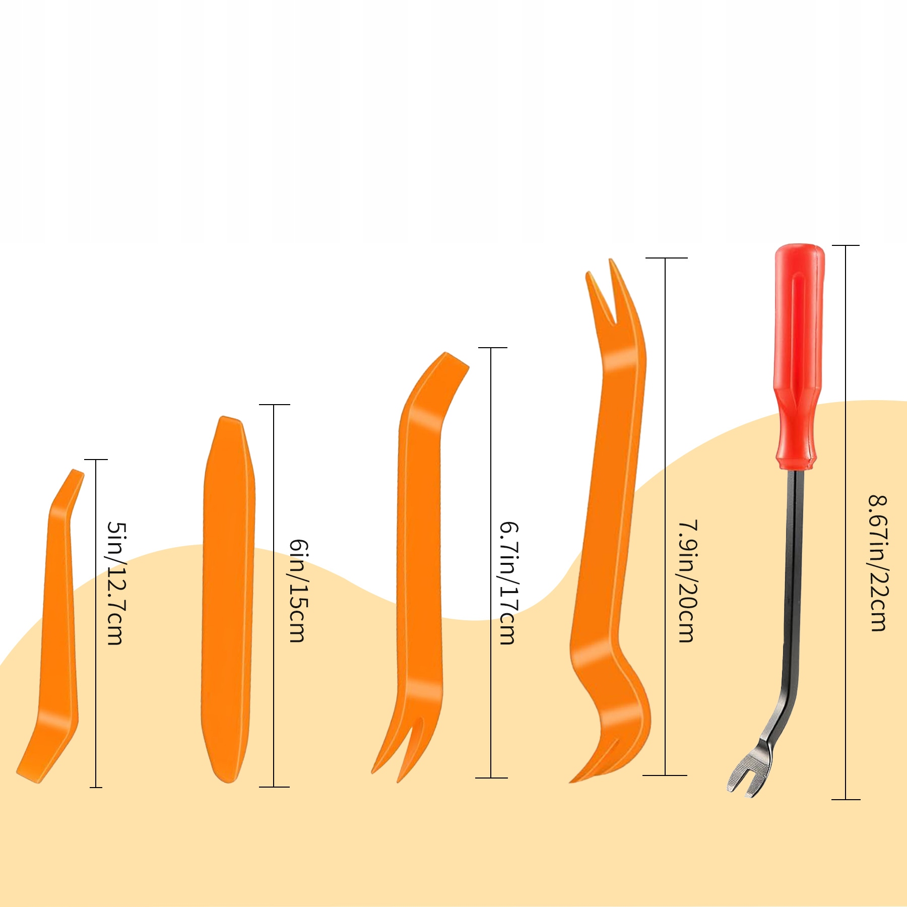 В комплект входят 4 ложки различной формы и размера, предназначенные для демонтажа обивки автомобиля и различных типов замковых элементов, 1 съемник штифтов и 10 зажимов. Благодаря им вы сможете разобрать каждый элемент обивки, не повредив его!