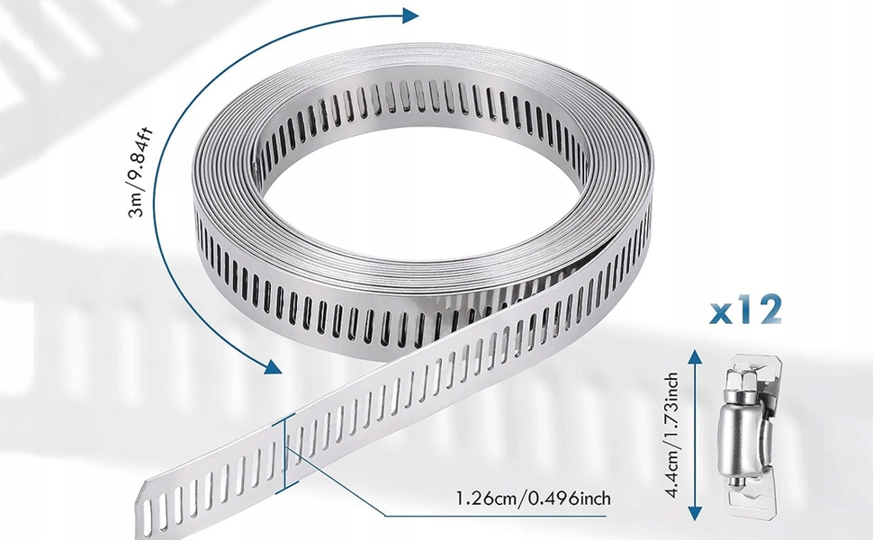⚙ Стальная зажимная полоса Регулируемая 3M x 12,6 мм+ терминалы 12 шт.