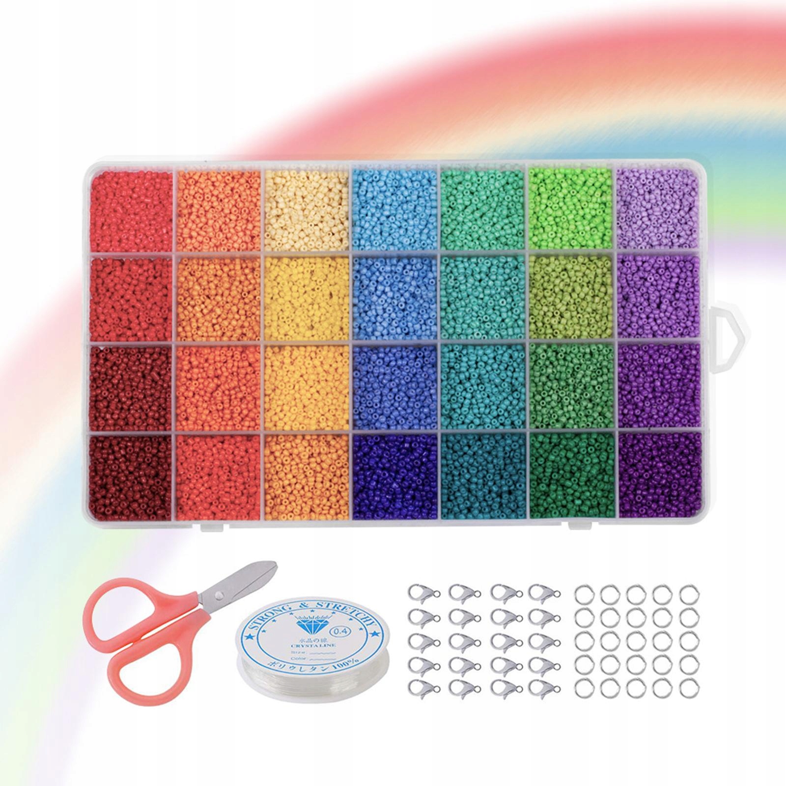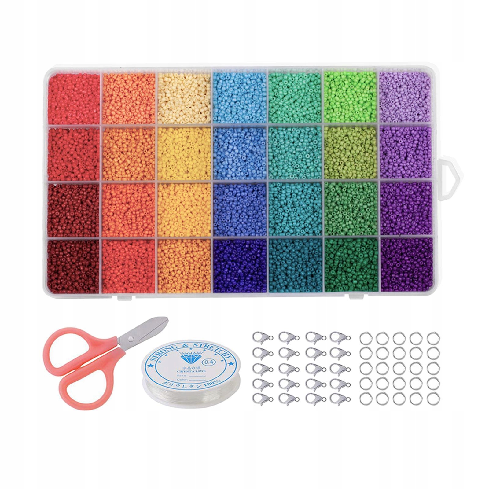 В комплект входят: 28000 разноцветных бусин диаметром 2 мм-28 цветов, 20 застежек-карабинов, 25 колец, 1 и 1 нить.