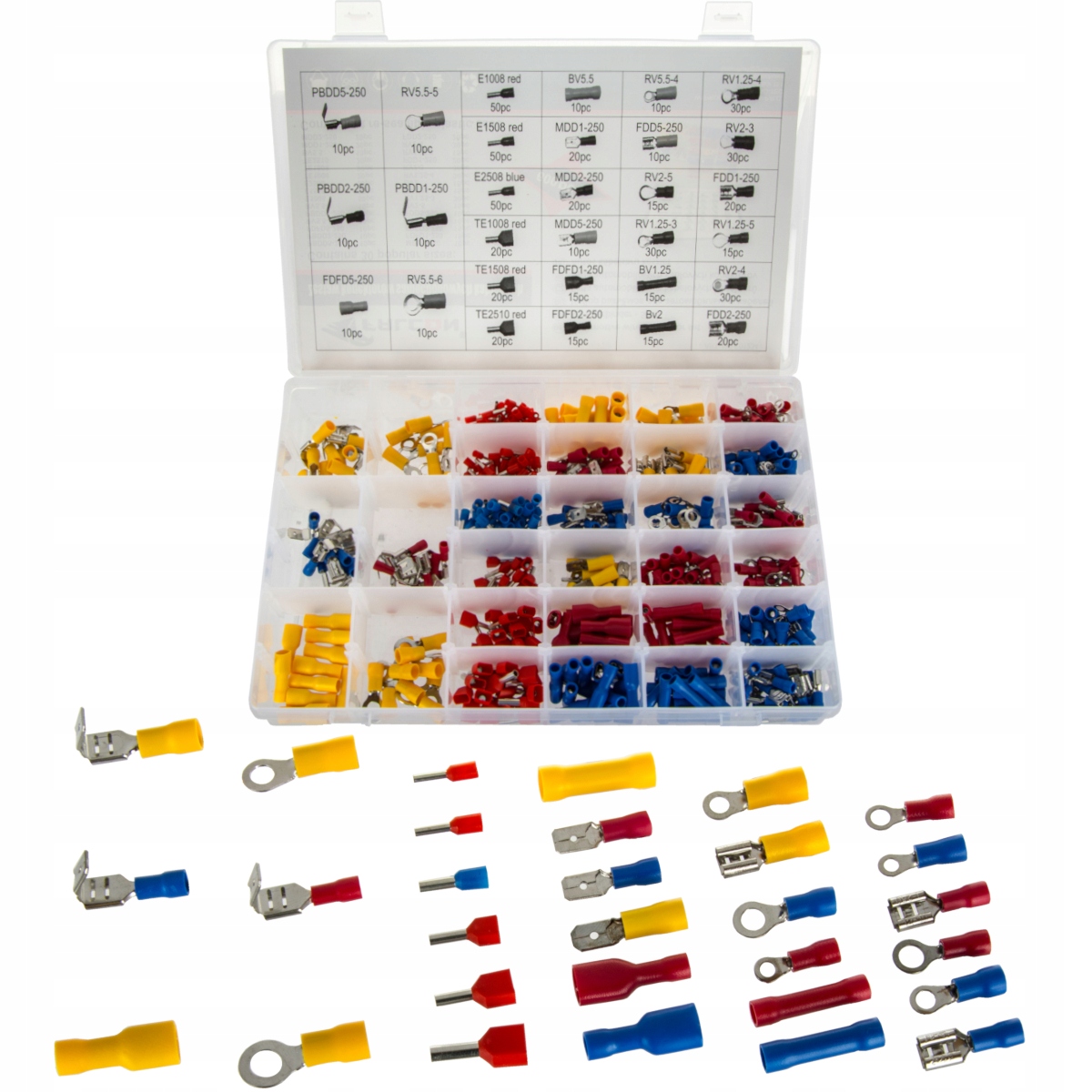 набор разъемов, кончиков и изолированных муфтов, в трех цветах и разных размерах, соответствующие самым популярным диаметрам электрических технологий. Элементы, и целое помещается в удобный прозрачный контейнер-организатор, благодаря которому вы можете легко контролировать количество концов.