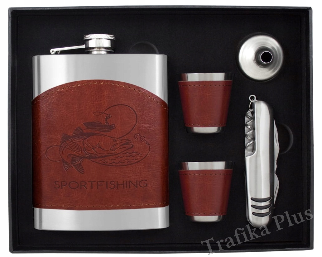 * флягу с емкостью объемом 240 мл, из нержавеющей стали, в оправе из коричневой эко-кожи с рыбацким мотивом