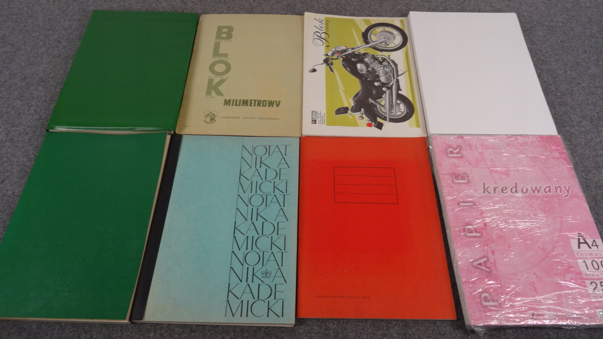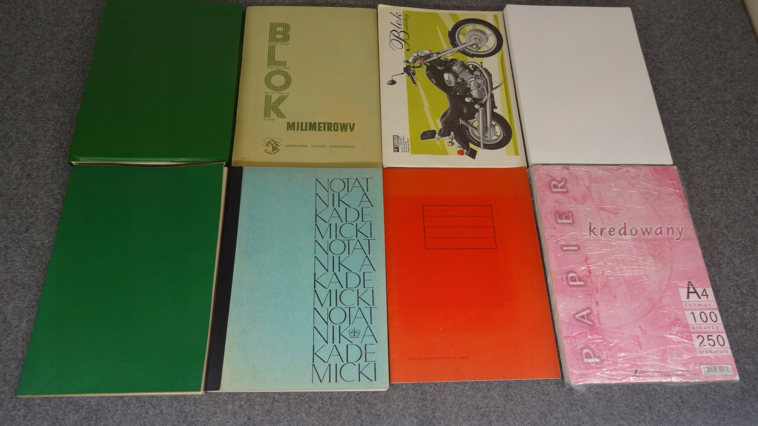 Набор из 8 штук различной канцелярской продукции: бумага мелованная, одна нераспечатанная упаковка 100 листов, вес 250, вторая открытая упаковка бумаги, примерно 80-90 штук, блокноты, тетради в клетку, миллиметровый блок , гладкий блокнот. Все в формате А4.