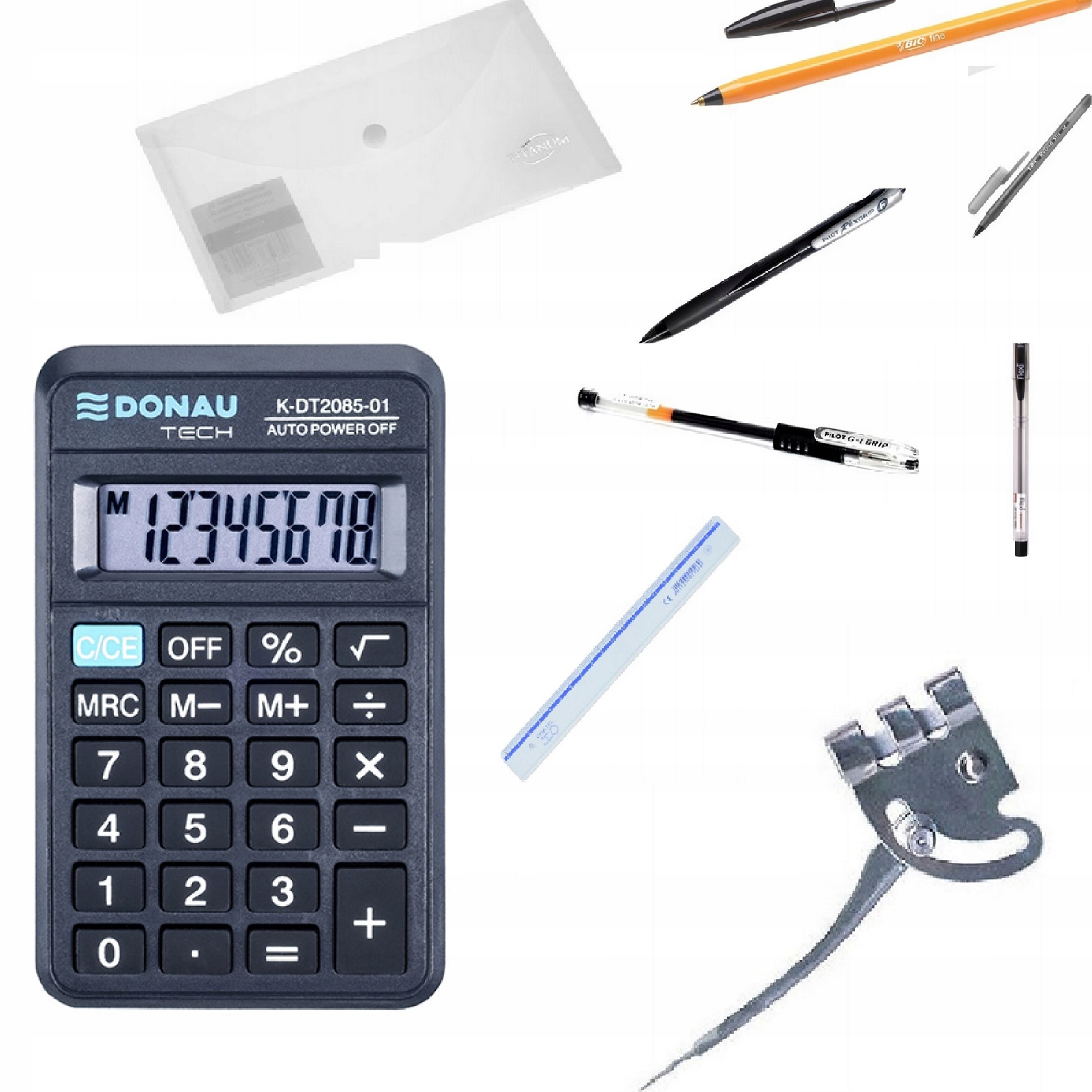 Легкий набор для выпускного экзамена, содержащий 5 различных ручек с черным стержнем, калькулятор, линейку и циркуль. Набор упакован в прозрачный пластиковый конверт с застежкой.