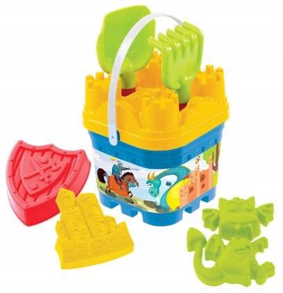 Набор состоит из синего ведра с графикой. с изображением дракона, рыцаря и замка. Ведро имеет крышку с отверстиями специально для размещения лопаты и граблей. Дополнительно в набор входят 3 песочные формы.