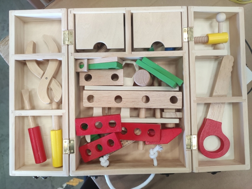 Набор для маленького любителя DIY состоит из традиционные инструменты с аксессуарами, расположенные в запертом ящике. Внутри деревянного футляра имеется множество отделений, в которых малыш сможет разместить аксессуары.