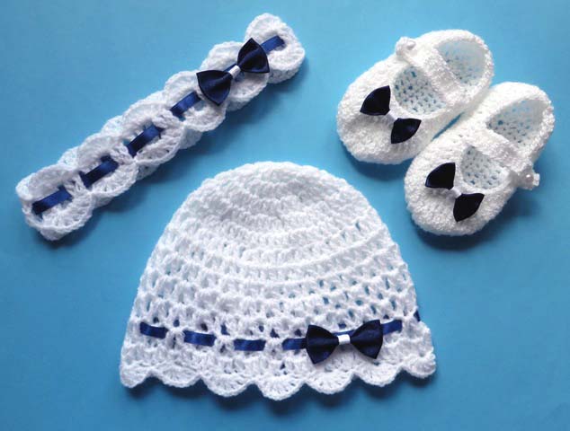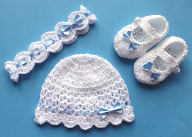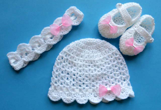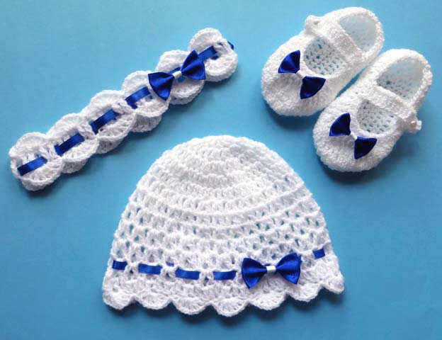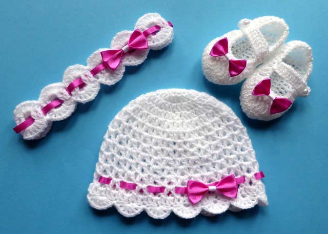 Комплект крючком из трех частей: шапка + туфли + повязка на голову могут быть выполнены из пряжи любого цвета, а фурнитура – с атласными (атласными) или шифоновыми (тюль) бантиками.