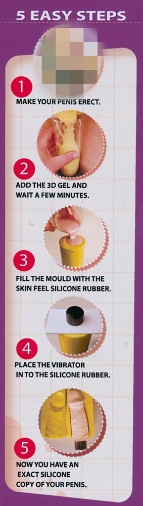 Инструкция по применению очень проста и проведет вас шаг за шагом: из полностью эрегированного пениса (благодаря эрекционной петле) вы можете всего за несколько минут сделать 3D-отпечаток в геле, а затем заполнить его силиконом. резину и вставьте прилагаемый вибратор.
