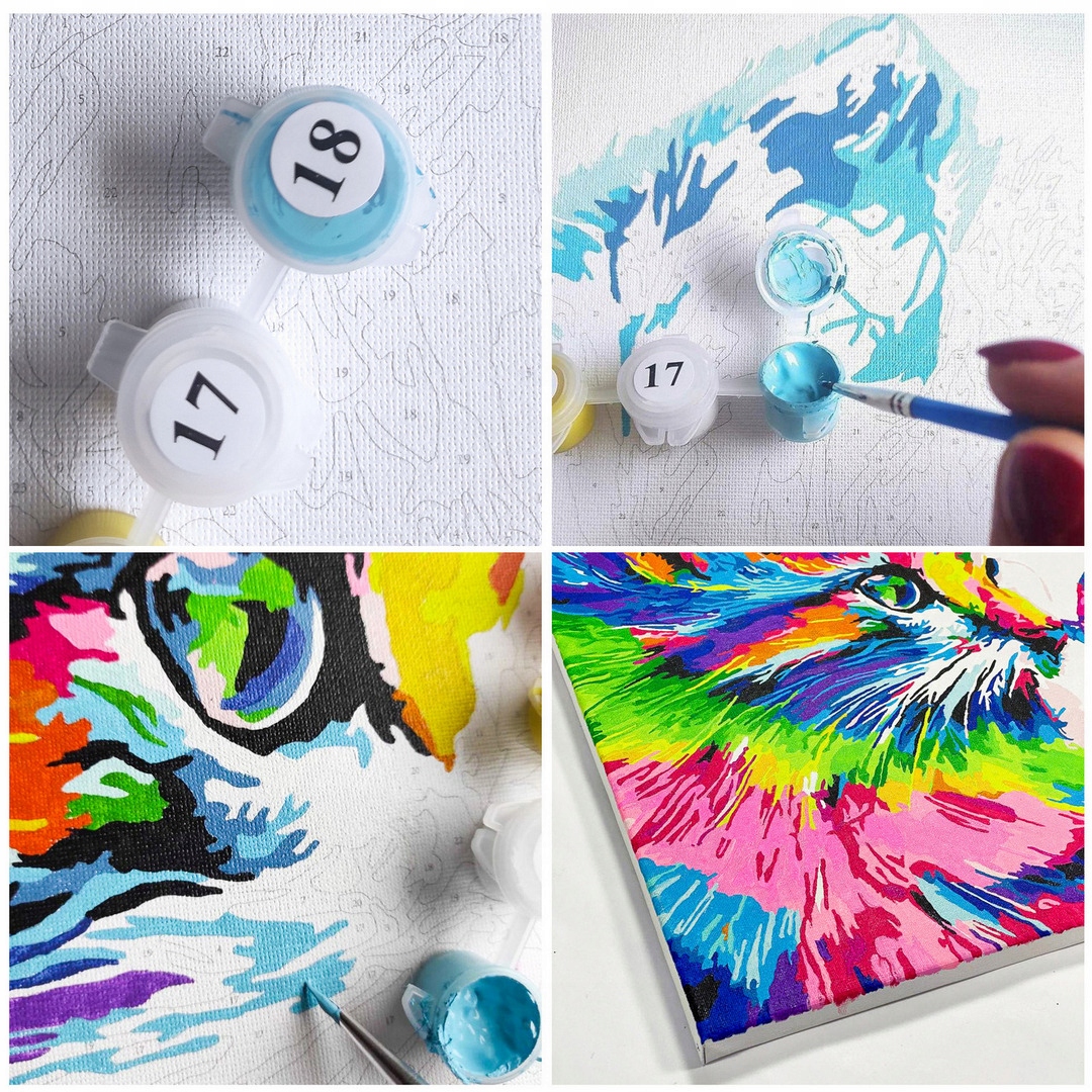 Краски хорошего качествав плотно закрытых упаковках, подходят для раскрашивания рисунка и не требуют смешивания цветов. Краски отличаются насыщенным цветом и изготовлены из безопасных ингредиентов. Чтобы исправить неправильно окрашенные участки, просто после высыхания покрасьте их краской соответствующего цвета. Чтобы черные линии схемы не проступали сквозь более светлые цвета, перед рисованием их можно также размыть белым карандашом, входящим в набор. Количества краски точно хватит, чтобы раскрасить картинку по номерам своими руками.