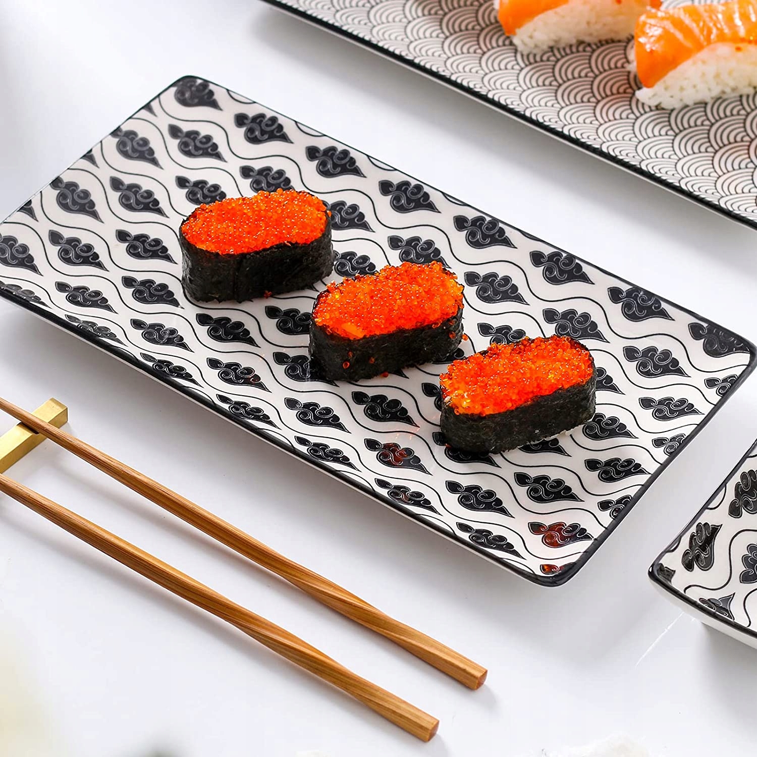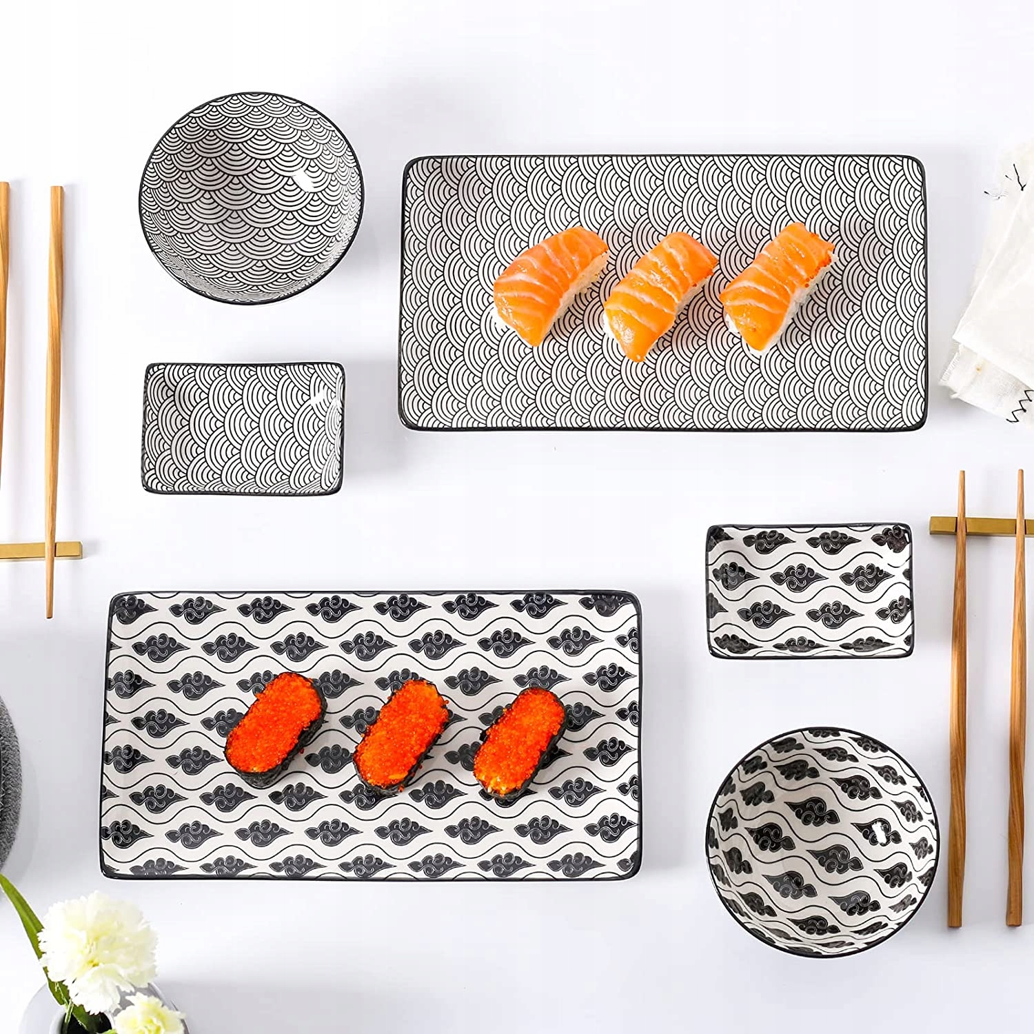 - ЯПОНСКИЙ СВЕТЛЫЙ ЦВЕТОВОЙ СТИЛЬ - Абсолютно великолепный набор с гладкой и мягкой текстурой и цветами. Дизайнеры черпают вдохновение в элементах японской культуры, великолепном сочетании 4 потрясающих узоров в оттенках черного и белого, добавляющих нотку Востока в ваш повседневный стол. Контраст, создаваемый разным рисунком, придает кухне индивидуальность и жизнь. ПРАКТИЧЕСКИЙ НАБОР ДЛЯ СУШИ – сочетание 4 разных дизайнов, стильное, яркое и уникальное. Отлично подходит для любителя суши, любителя японской культуры. В комплект входят 2 прямоугольные тарелки для суши, 2 миски по 330 мл, 2 миски для соуса и 2 пары палочек для еды. Пластины прочные, но не слишком толстые и выдерживают множество циклов мытья в посудомоечной машине, нагрев в микроволновой печи и повседневное использование. ДЛЯ ПОВСЕДНЕВНОГО ИСПОЛЬЗОВАНИЯ, СЛУЧАЕВ, ПОДАРКА - Наборы тарелок пользуются успехом в семье, они красиво выглядят и легко чистятся, оживляя любой стол. Захватывающий контраст, создаваемый четырьмя различными узорами, придает кухне индивидуальность и жизнь. Это, несомненно, подарит вам незабываемые впечатления от ужина, будь то официальное или неформальное мероприятие. В комплекте идет подарочная коробка, это также идеальный подарок для любителей суши или любителей японской культуры. БЕЗОПАСНО И ПРОЧНО — сертифицировано FDA, нетоксично и безвредно, не содержит свинца и кадмия. Данное изделие представляет собой высокотемпературный обжиг нежного фарфора, высокой плотности, прочность в два раза выше, чем у обычных. Устойчив к сколам, трещинам, долговечен, можно использовать в микроволновой печи и мыть в посудомоечной машине. Фарфоровые тарелки и миски окрашиваются неорганическими пигментами при высоких температурах, благодаря чему керамика не тускнеет.