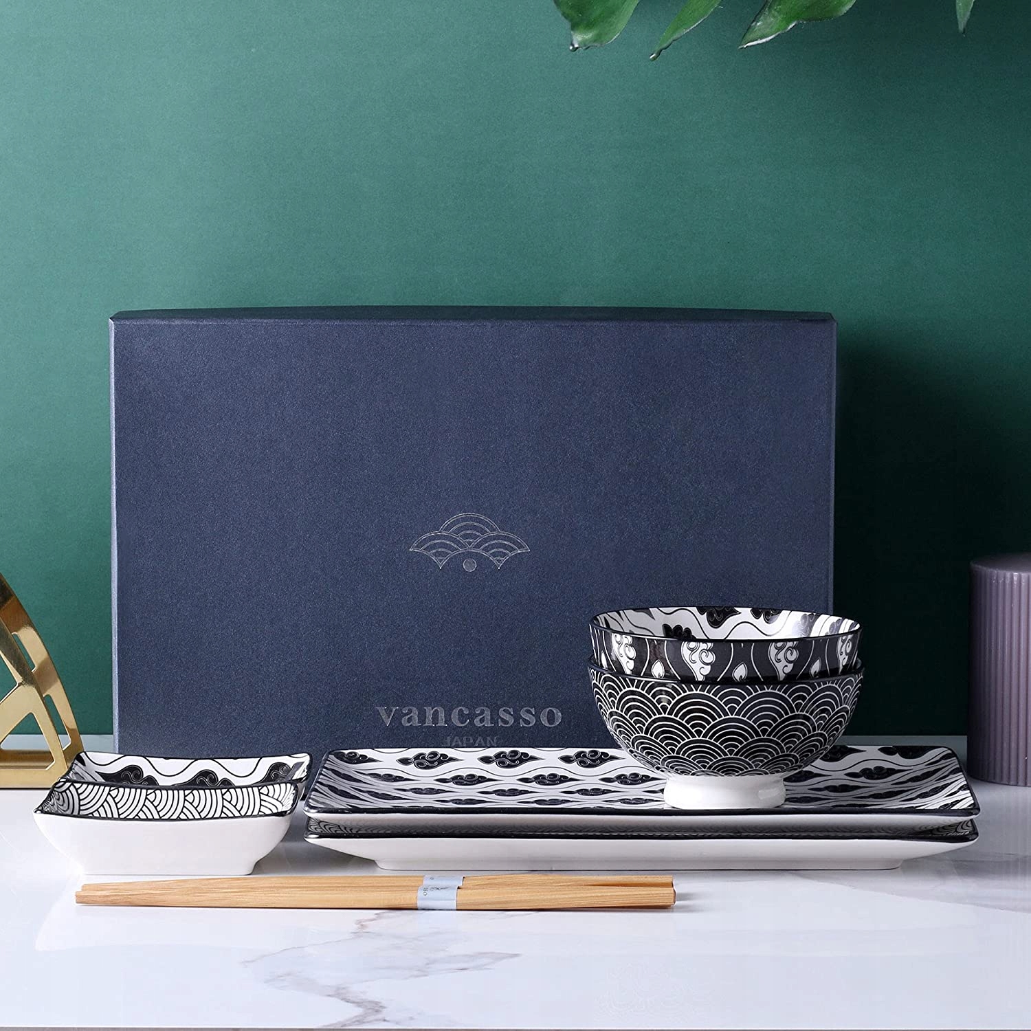 Vancasso Haruka Фарфоровый набор тарелок для суши на 2 персоны, керамика в японском стиле, черно-белый, 8 предметов, сервировочный набор для суши, включая тарелки для суши | Суши-боулы | Миски для погружения | Палочки для еды, подарочная коробка