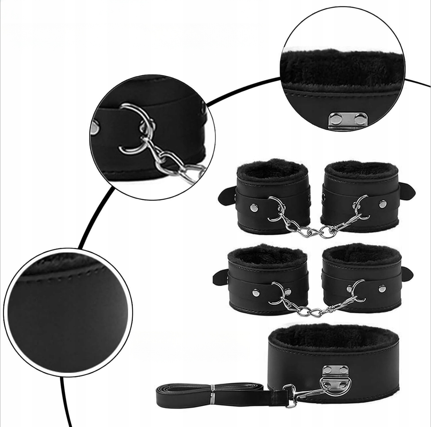 Этот комплект, изготовленный из высококачественной искусственной кожи, мягкого хлопка и нейлона, рассчитан на долгий срок службы. Материалы нежны к коже, что позволяет длительное использование без раздражения. Металлические элементы обеспечивают долговечность и надежность, гарантируя безопасность и удовольствие как вам, так и вашему партнеру.