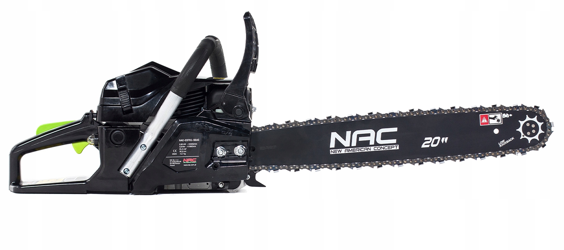 - ✅Бензопила NAC CST52-45-01AC — современное устройство, оснащенное мощным двухтактным двигателем мощностью 49,3 л.с. см³ и равна 3 л.с.