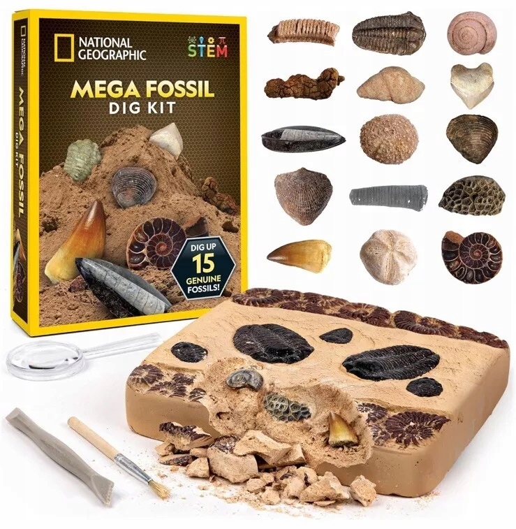 National Geographic Set Mega Fossil Dig Комплект - раскопки из 15 настоящих доисторических окаменелостей, набор ископаемых для детей, образовательная игрушка, отличный научный дар для девочек и мальчиков