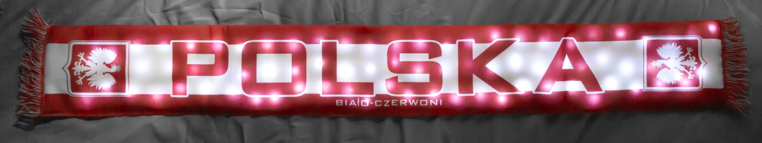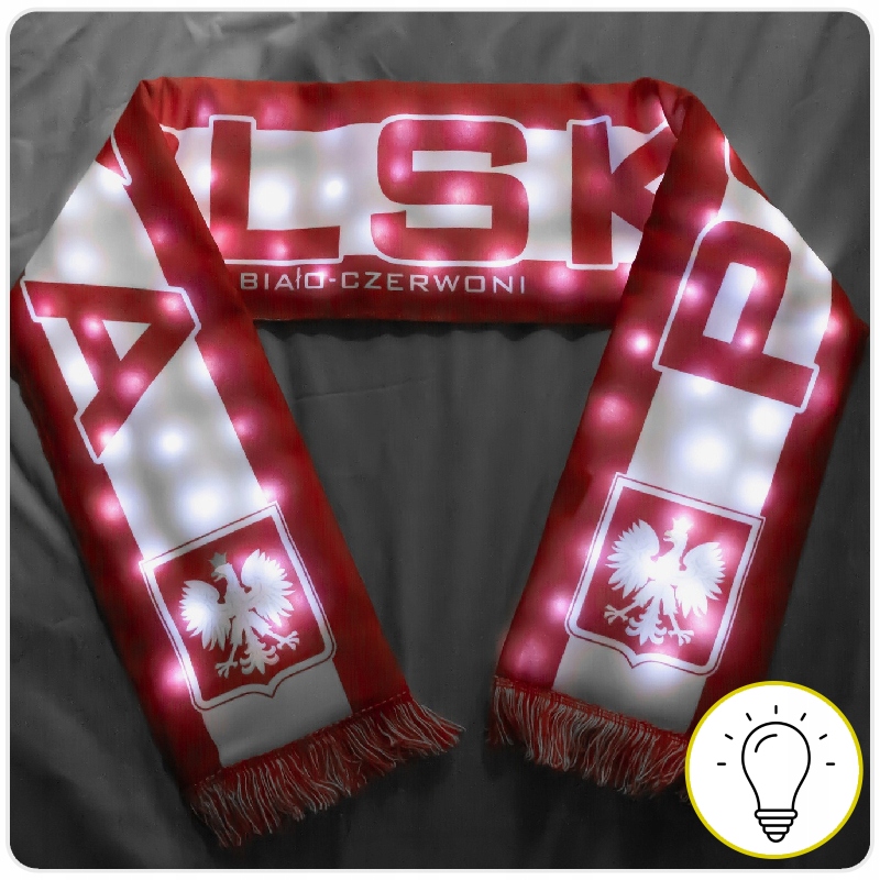 ➡️ Покажите свою поддержку сборной в уникальном стиле! Шарф для болельщиков Польши со светодиодной подсветкой – идеальный выбор для каждого болельщика. Двусторонний дизайн и светящиеся элементы выделят вас на стадионе и во время любого спортивного мероприятия. Заряжается через USB, это удобно и экологично.