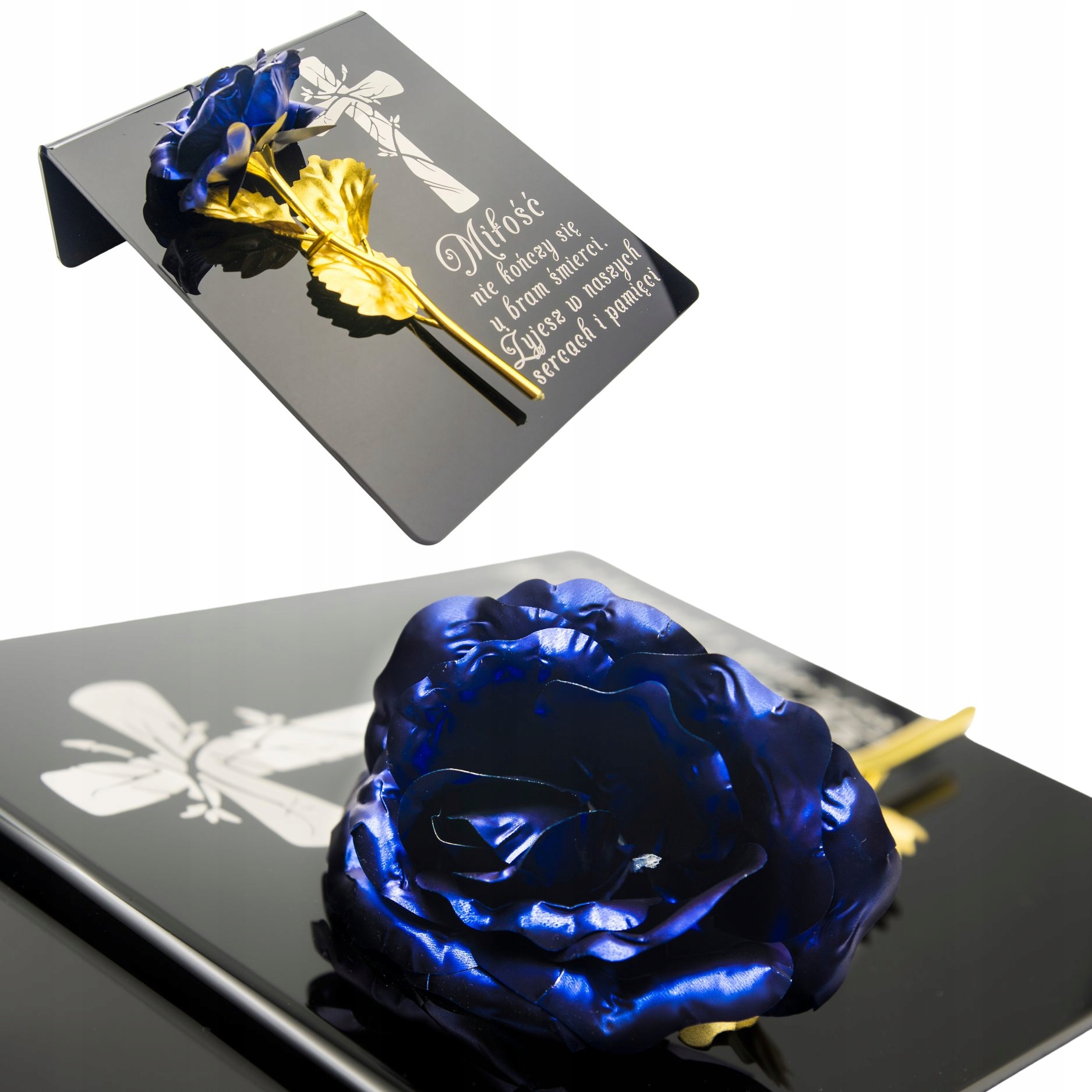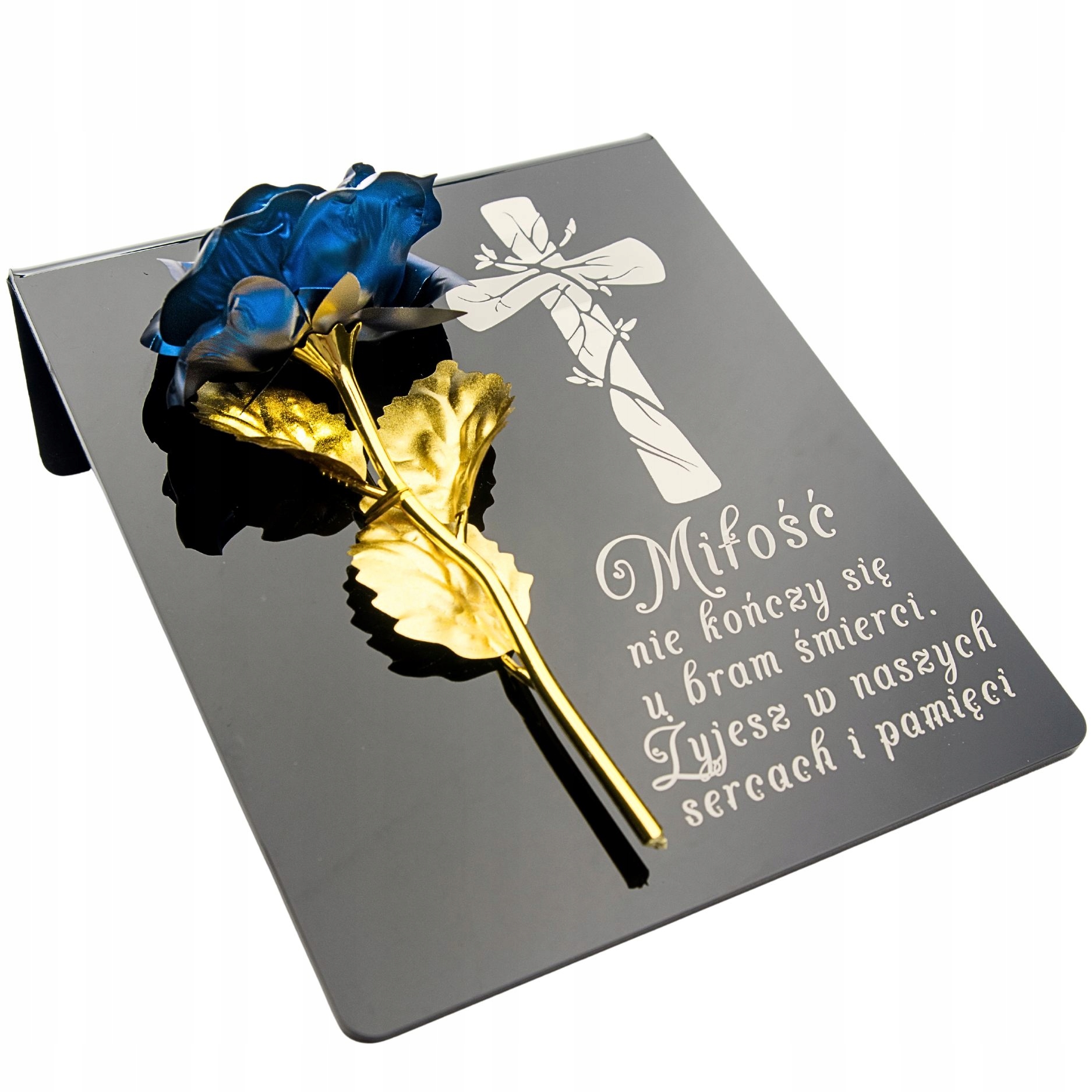 Синяя и золотая роза на постаменте с гравировкой