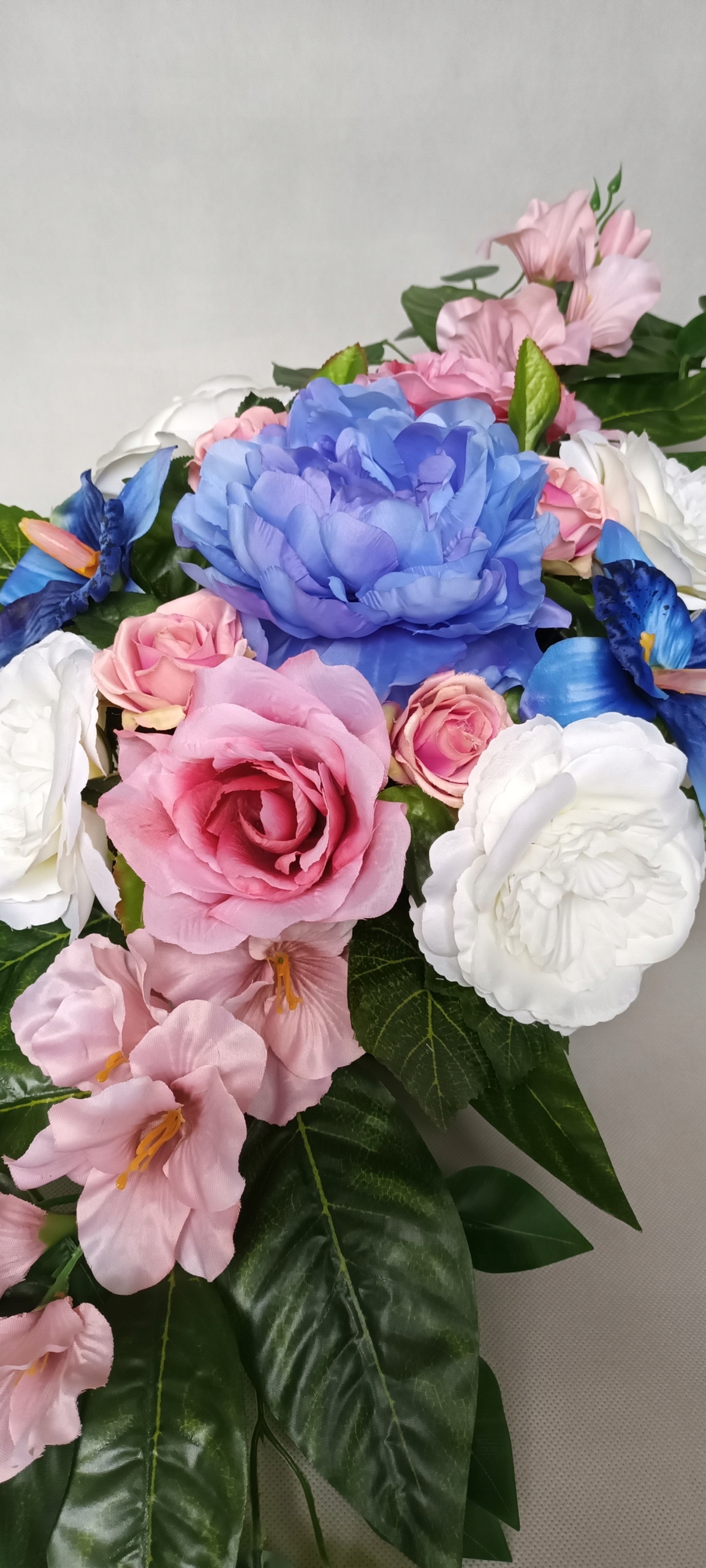 Цветочная композиция выполнена из качественных искусственных цветов.