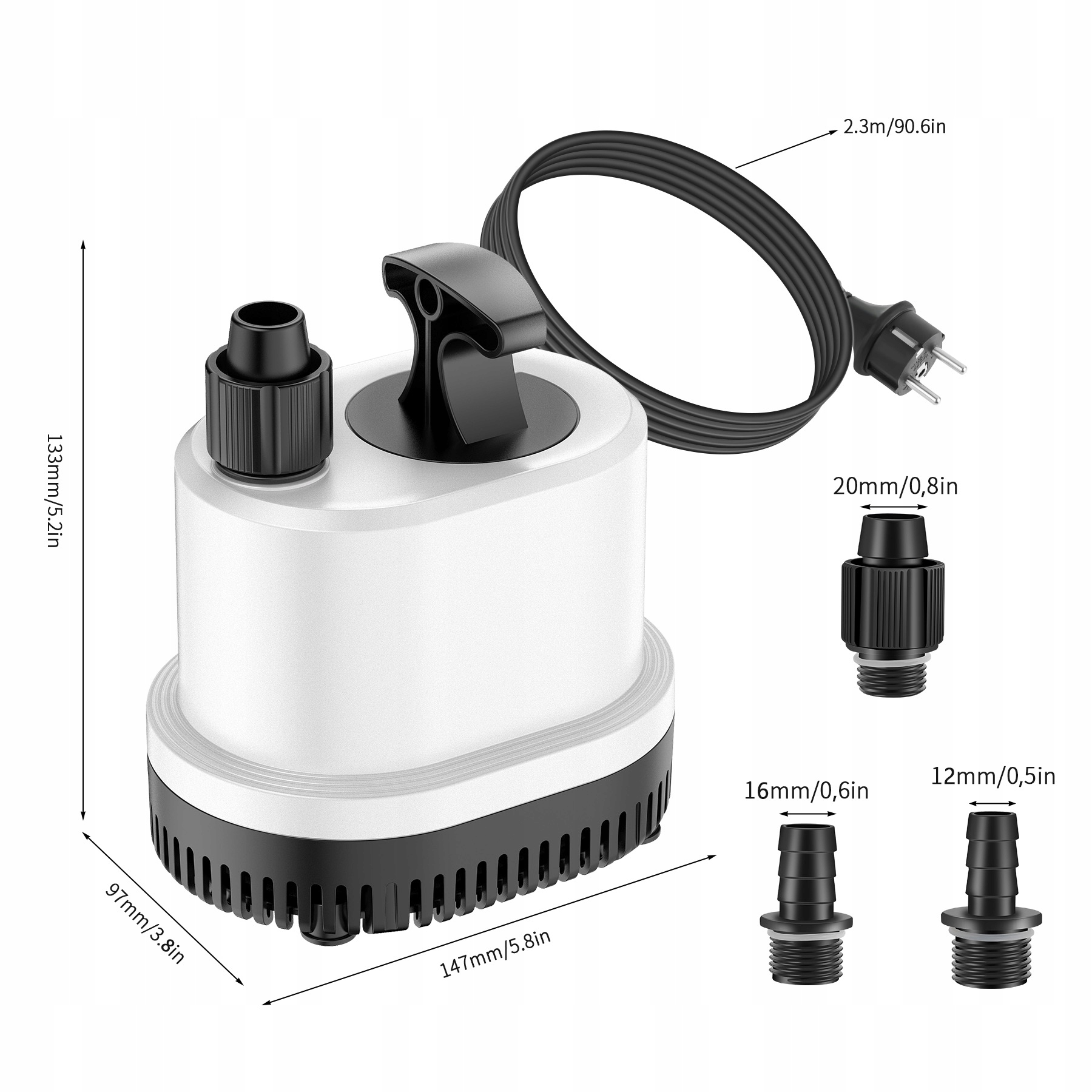 Мощность: 40 Вт, Расход: 2500 л/ч, Максимальная высота: 2,3 м, Калибр водоотвода: φ12/16/18 мм, Длина кабеля: 2,3 м, Высокий двигатель мощность, низкий уровень шума, высокая эффективность.