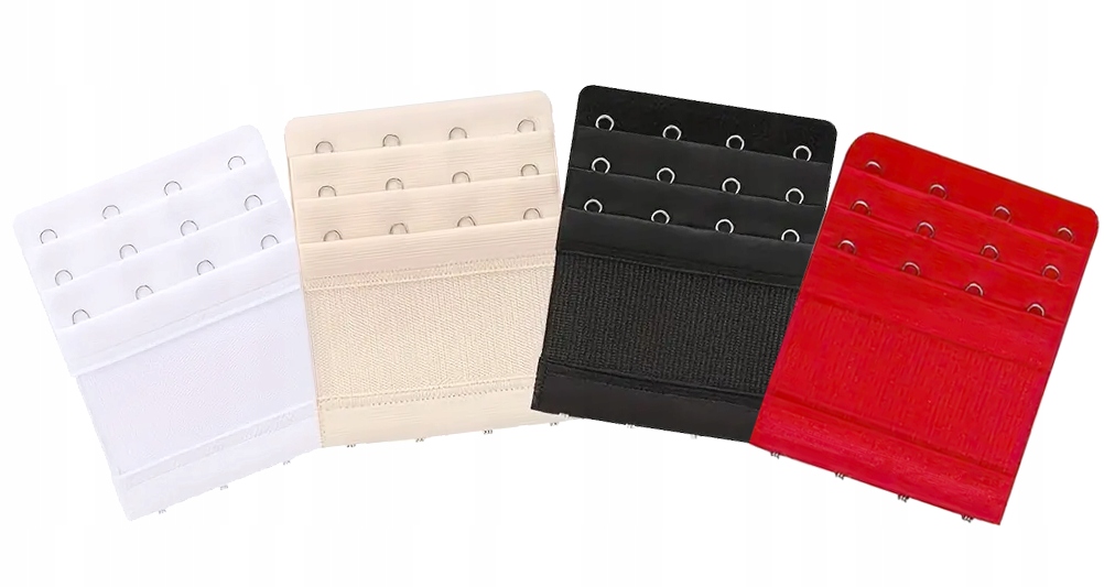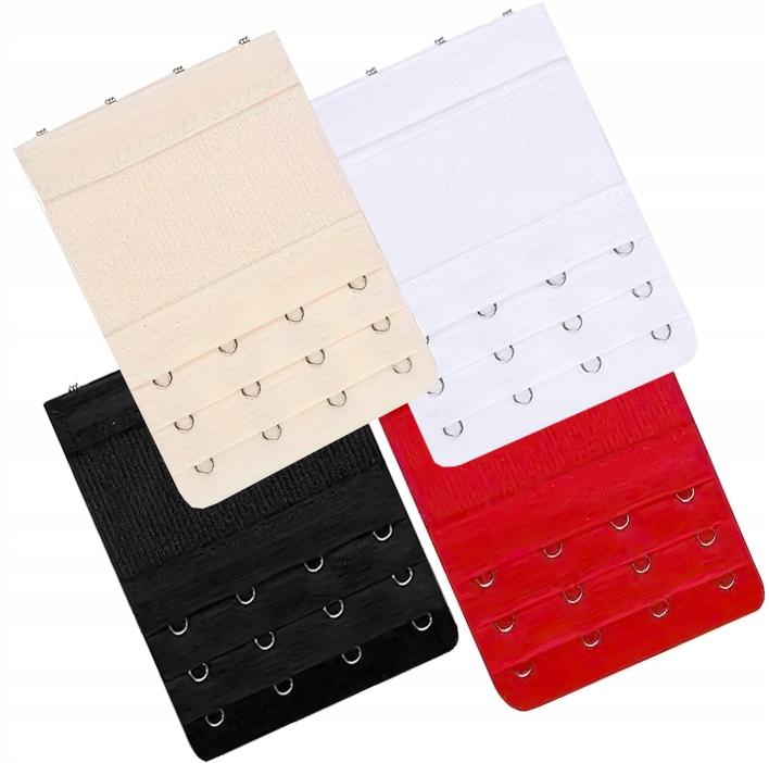 Набор из 4 практичных удлинителей бюстгальтера классических цветов: красного, белого, бежевого и черного. Благодаря им вы сможете легко расширить окружность бюстгальтера и добиться большего комфорта при ношении. Каждое удлинение имеет 3 ряда крючков, расположенных в 4 столбика, что позволяет точно подогнать его по фигуре. Резинка дополнительно повышает комфорт и сцепление.