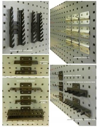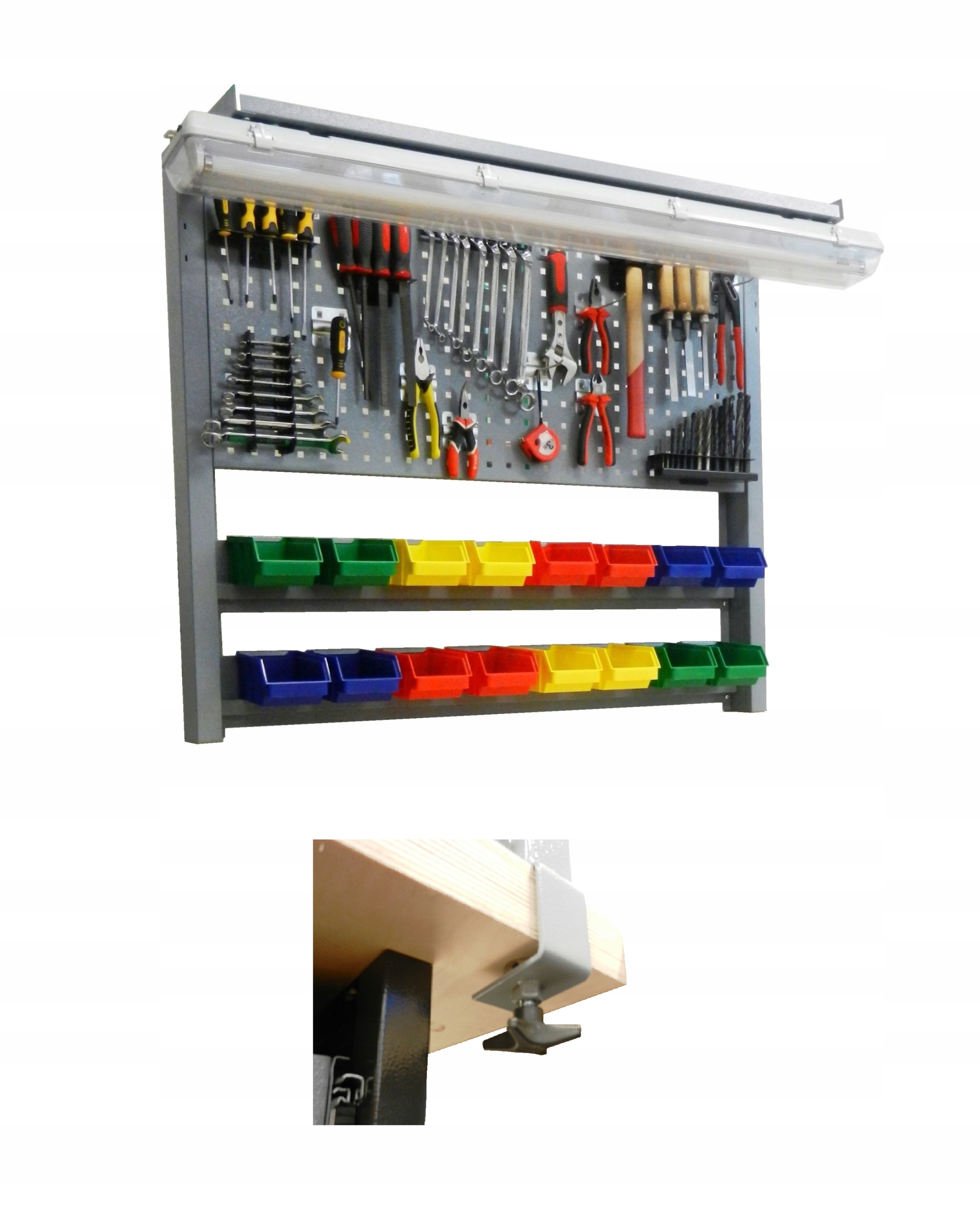 - оснащен перфорированной стенкой (квадратная перфорация) и двумя кронштейнами для подвешивания контейнеров для мелких элементов, каждый кронштейн имеет 8 слотов для контейнеров.