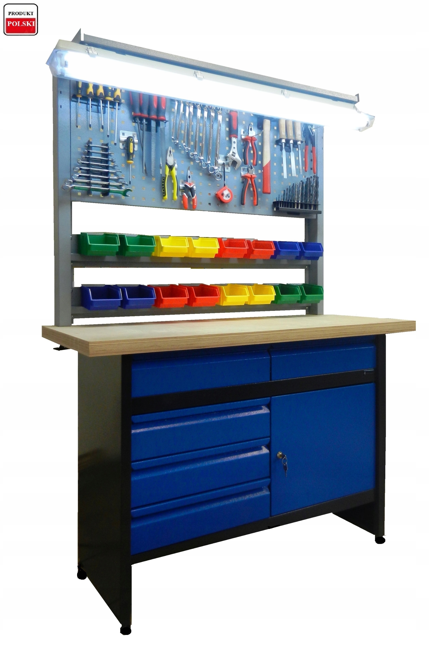 - оснащен перфорированной стенкой (квадратная перфорация) и двумя кронштейнами для подвешивания контейнеров для мелких элементов, каждый кронштейн имеет 8 слотов для контейнеров.