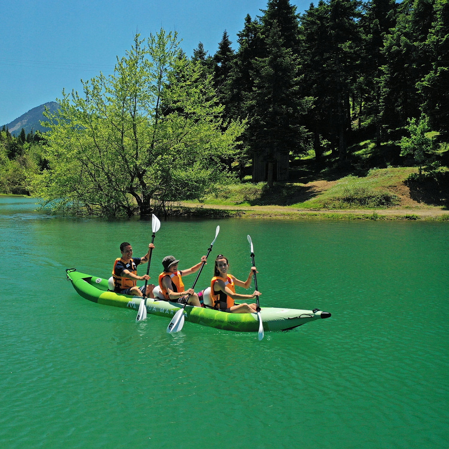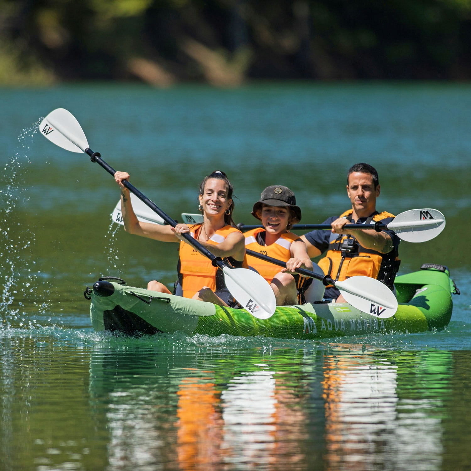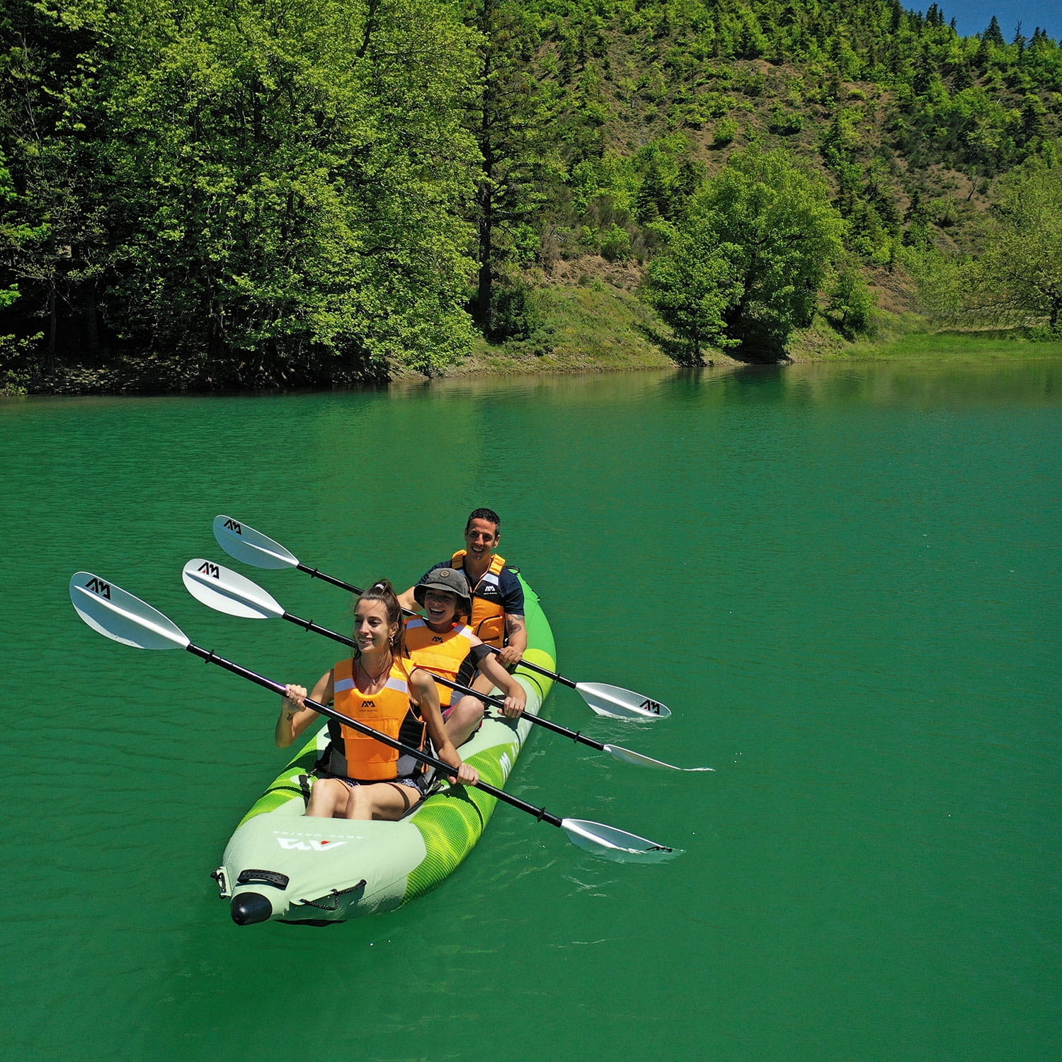 В комплект каяка входят, среди прочего: 3 весла для каяка, насос, 2 ласты и 3 сиденья.