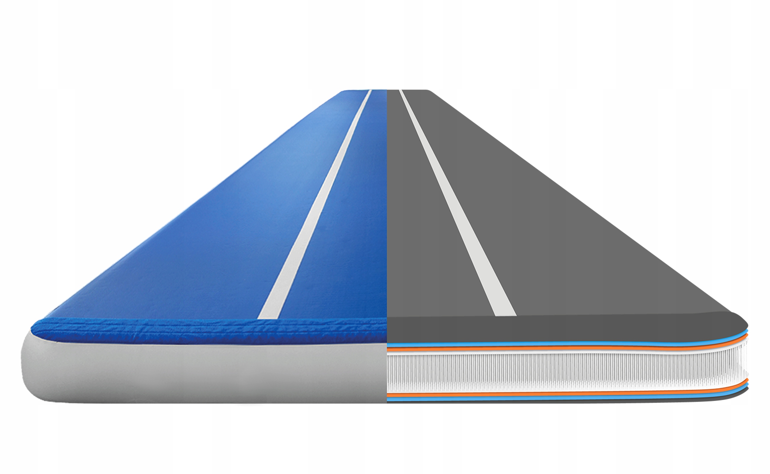 Надувная дорожка изготовлена из специального ПВХ-материала (тканевый ПВХ с двойными стенками). Особенностью этого материала является то, что верхняя и нижняя части воздушной дорожки соединены друг с другом с помощью тонких прочных волокон. Они заполняют всю внутреннюю часть коврика, не позволяя ему растекаться и терять эластичность.