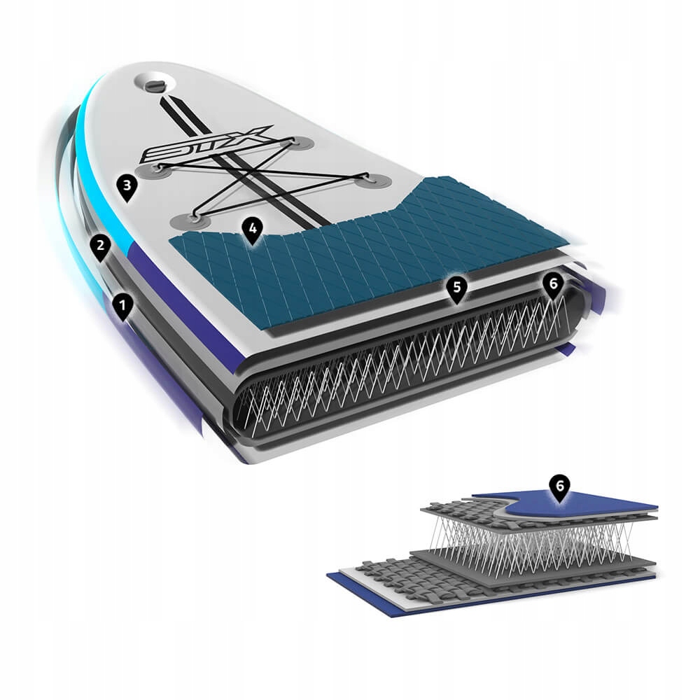 Все доски STX изготавливаются по технологии FXL, Fusion Double Layer X Light — технологии производства двухслойных SUP-плат, при которой два слоя ПВХ соединяются между собой горячим способом. Дополнительно внутренний слой материала тканевый, что значительно снижает вес и одновременно повышает долговечность доски. Использование технологии FXL также влияет на жесткость досок – меньшая растяжимость материалов и возможность накачивания до 20psi – более жесткая доска меньше сгибается и развивает более высокие скорости.
