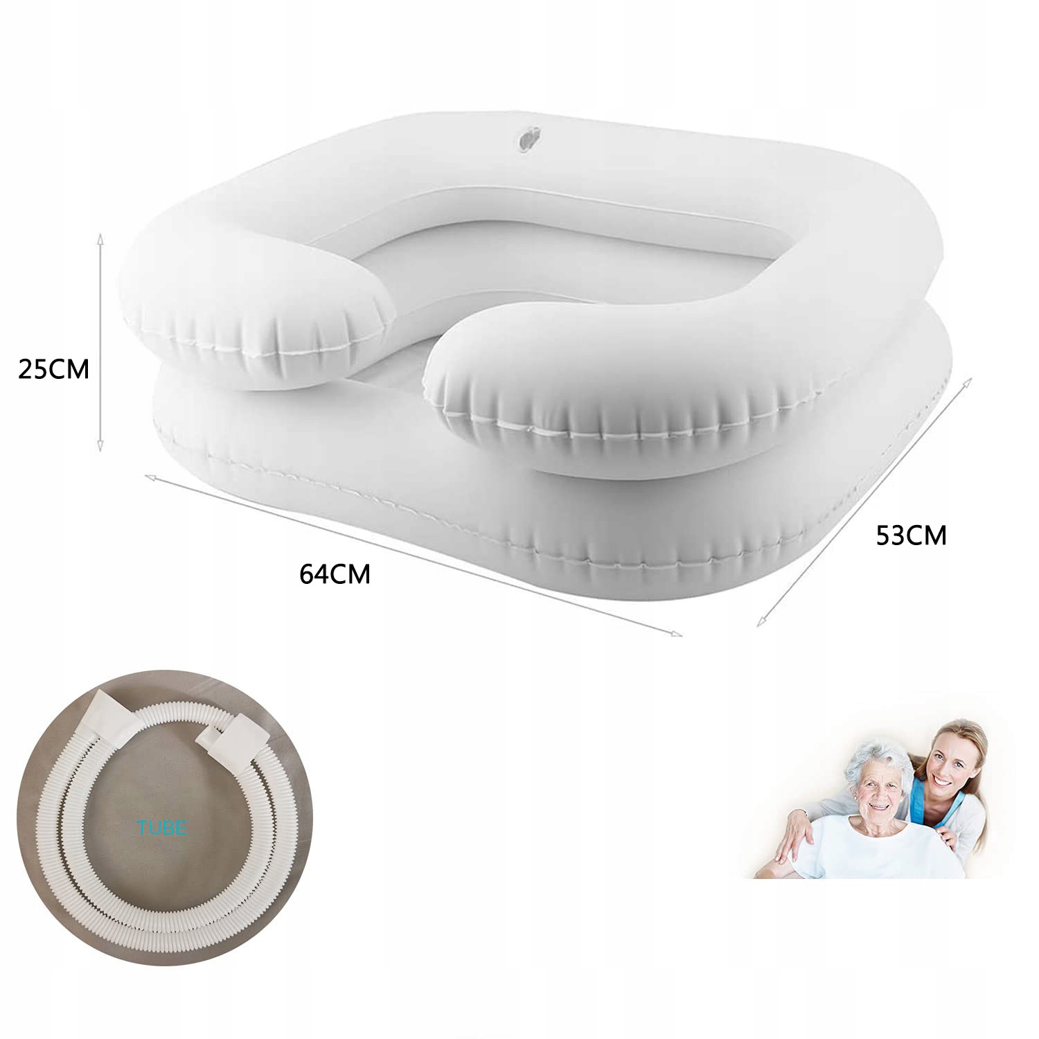 🎈🎈Высококачественный материал:Надувная раковина для волос изготовлена из высококачественного утолщенного ПВХ-материала, который мягкий и удобный, экологически чистый и износостойкий. Размеры: 64 х 53 х 25 см. ⭕Контейнер для шампуня + пластиковый шланг.