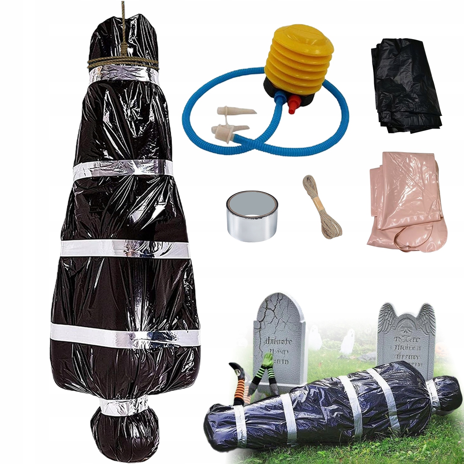 👻Простая сборка: Просто поместите надувное тело в черный пластиковый пакет и закрепите веревкой и лентой. Их можно легко повесить в разных местах, обеспечивая быстрый и простой монтаж.