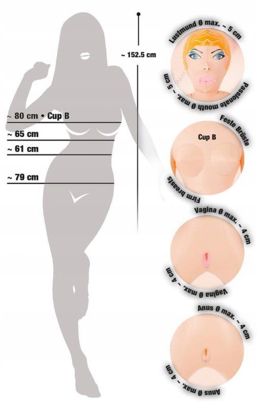 Эта великолепная женщина с рельефным лицом и волосами имеет три манящие, узкие любовные дырочки. В положении стоя, руки скрещены, открыты для объятий.