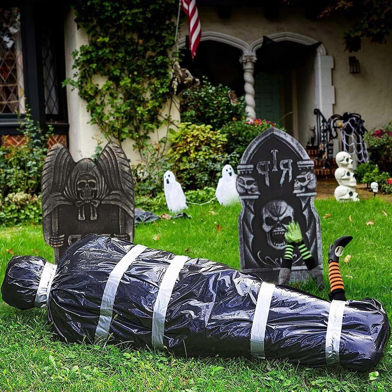 Декоративная надувная сумка для тела TETSMG — идеальный реквизит для Хэллоуина, который добавит жуткую атмосферу в ваш сад или на тематическую вечеринку. Изготовленное из прочного полиуретана, оно рассчитано на многократное использование, а его увеличенная высота (163 см в надутом состоянии) соответствует реалистичным размерам человеческого тела, что усиливает эффект страха.
