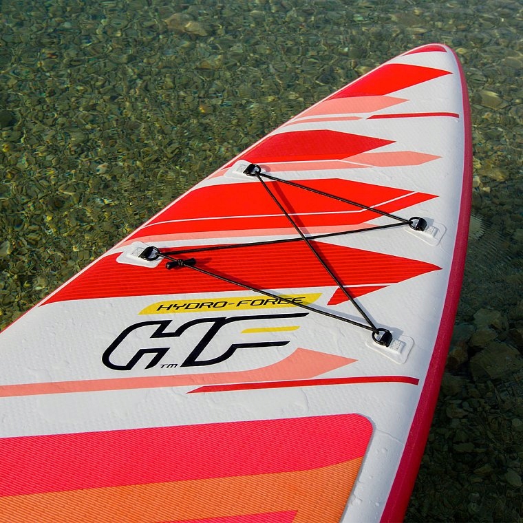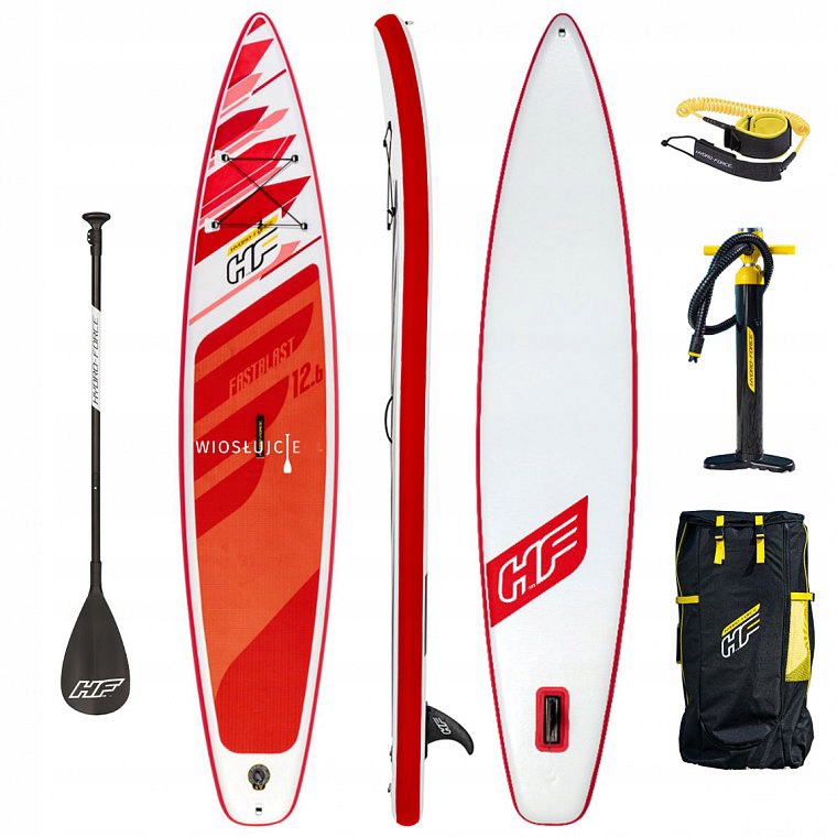 HYDRO FORCE FASTBLAST TECH 12'6 — надувная доска для серфинга на границе двух категорий Touring и Race. Он предназначен для более продвинутых спортивных гребцов, предпочитающих более быстрые доски. Паддлборд также подходит для длительных поездок. SUP характеризуется лучшей скоростью, которую мы можем достичь на нем по сравнению с другими досками. Его заостренная форма прекрасно рассекает воду и позволяет развивать хорошую скорость. Он предназначен для более спокойной воды для райдеров весом до 120 кг (вам нужна доска большего размера? Обратите внимание на FREESOUL 11'2 COMBO WindSUP).