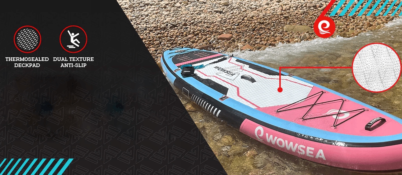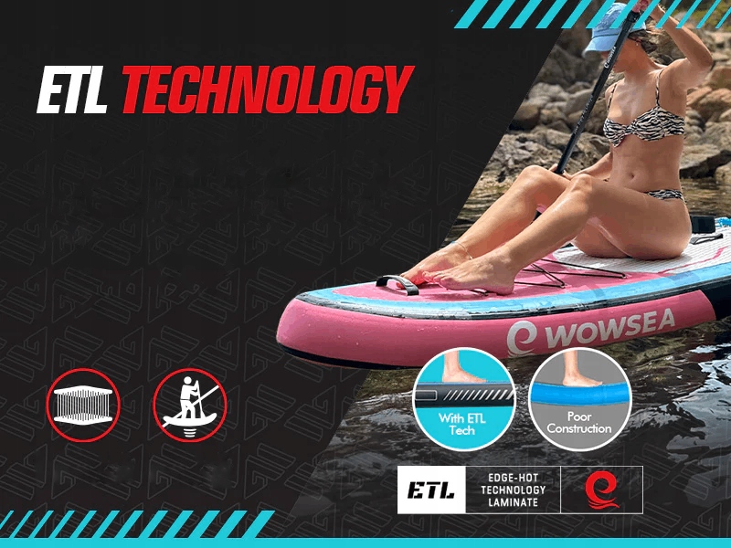 WOWSEA использует ламинат ETL (ламинат с технологией Edge-hot Technology) для производства досок для SUP премиум-класса. Плотность усиленной строчки составляет 11 200/м², что обеспечивает комфорт купания и долгий срок службы досок SUP.